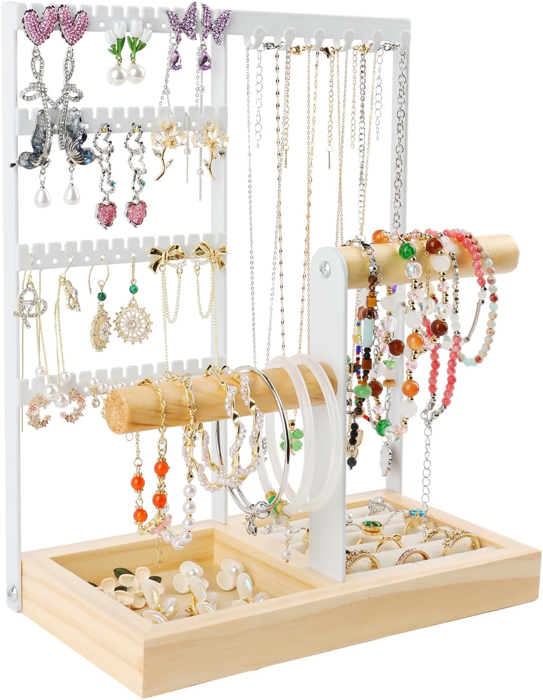 Présentoir à Bijoux, Présentoir à bijoux porte-chaîne avec Base en Bois, Porte Collier Boucles d’Oreille, Organisateur de Bijoux pour bagues