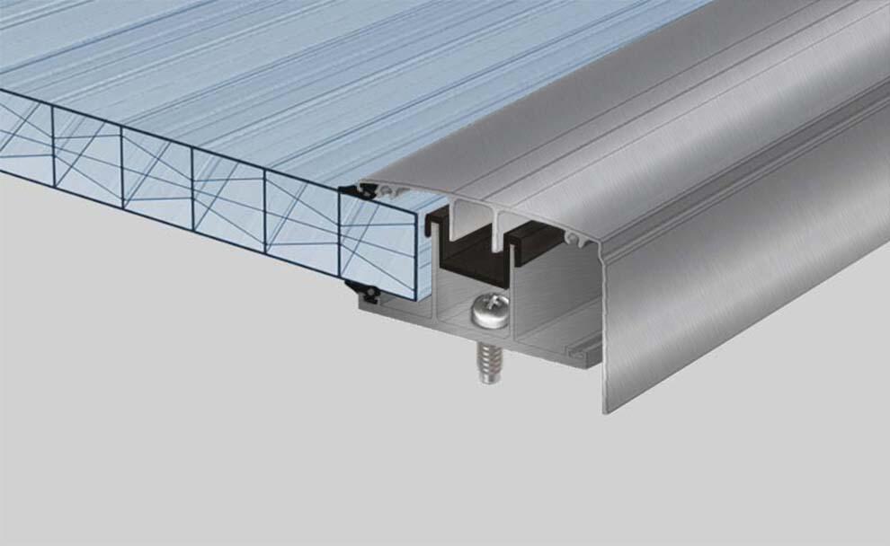 Kit déjà monté composé par: profils supérieur et inférieur, 4 joints et profil languette en PE pour isolation thermique. Utilisé pour la jonction des plaques de polycarbonate alévolaire 16mm -3m . Profils non porteurs: doivent être soutenus par des chevrons. A positioner tous les mètres.
