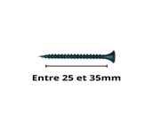 Entre 25 et 35 mm Vis polyvalentes. Fixation de plaques de plâtre sur des isolants fins, réparations et ajustements mineurs.
