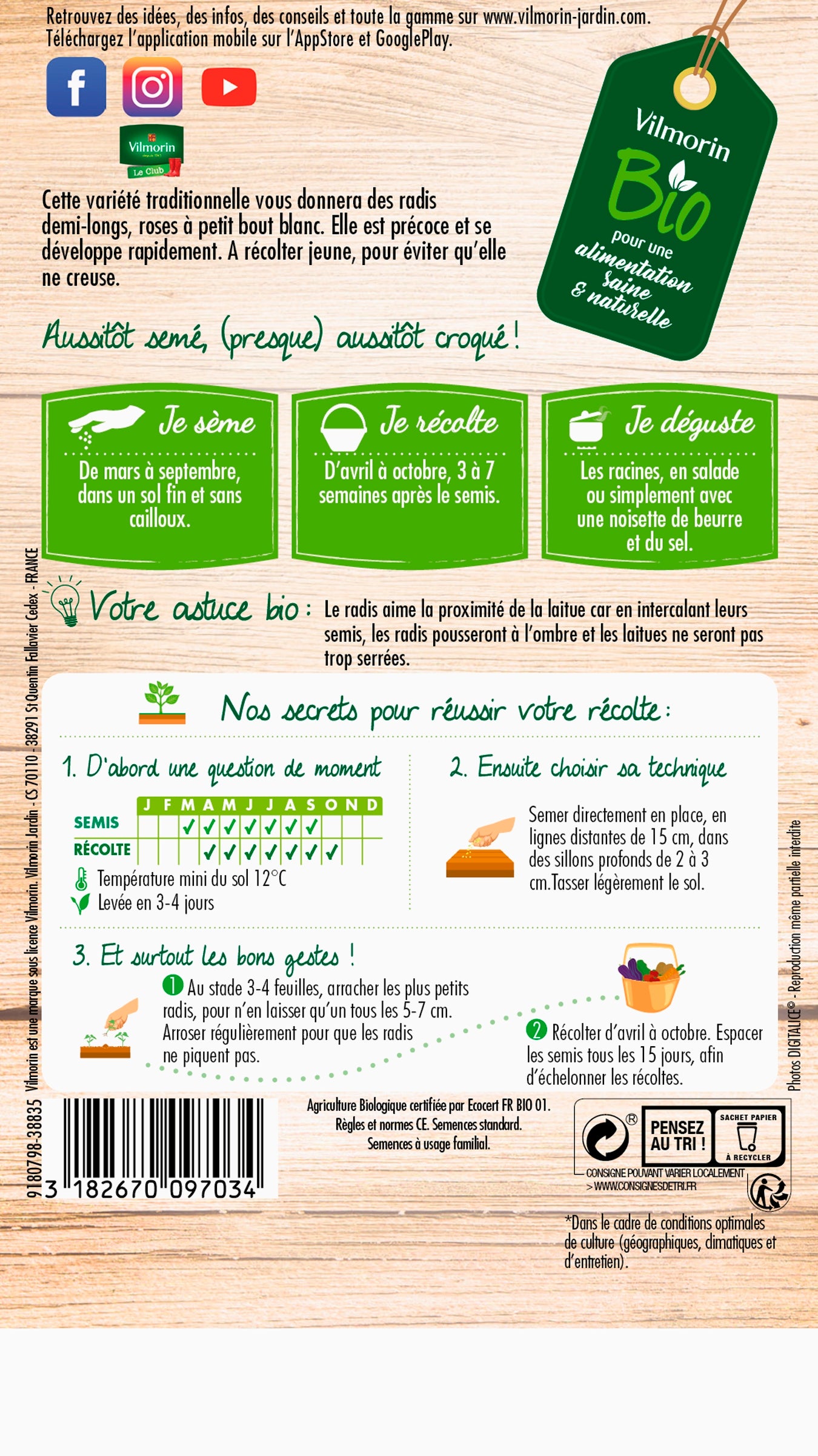 Cette variété traditionnelle vous donnera des radis demi-longs, roses à petit bout blanc. Elle est précoce et se développe rapidement. A récolter jeune, pour éviter qu'elle ne creuse.
