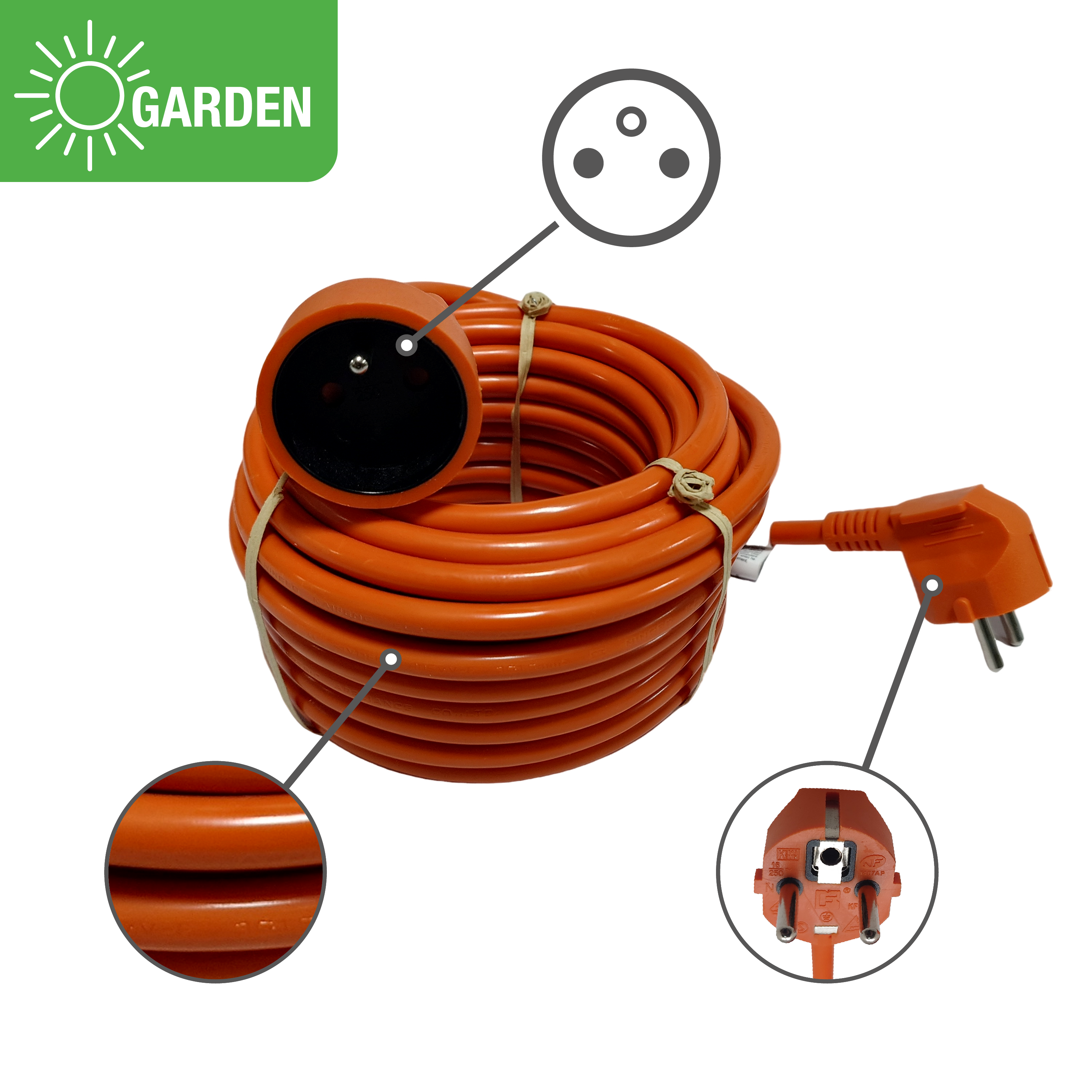 Rallonge électrique 20M jardin avec terre LEXMAN : Branchez vos appareils de jardin (tondeuse à gazon, taille-haie) à une prise de courant. Rallonge de couleur orange, ce qui la rend facilement visible. Son câble résistant de 20 mètres vous offre une grande liberté de mouvement. Ampérage 16A. Pour une utilisation en extérieur. Garantie 5 ans.