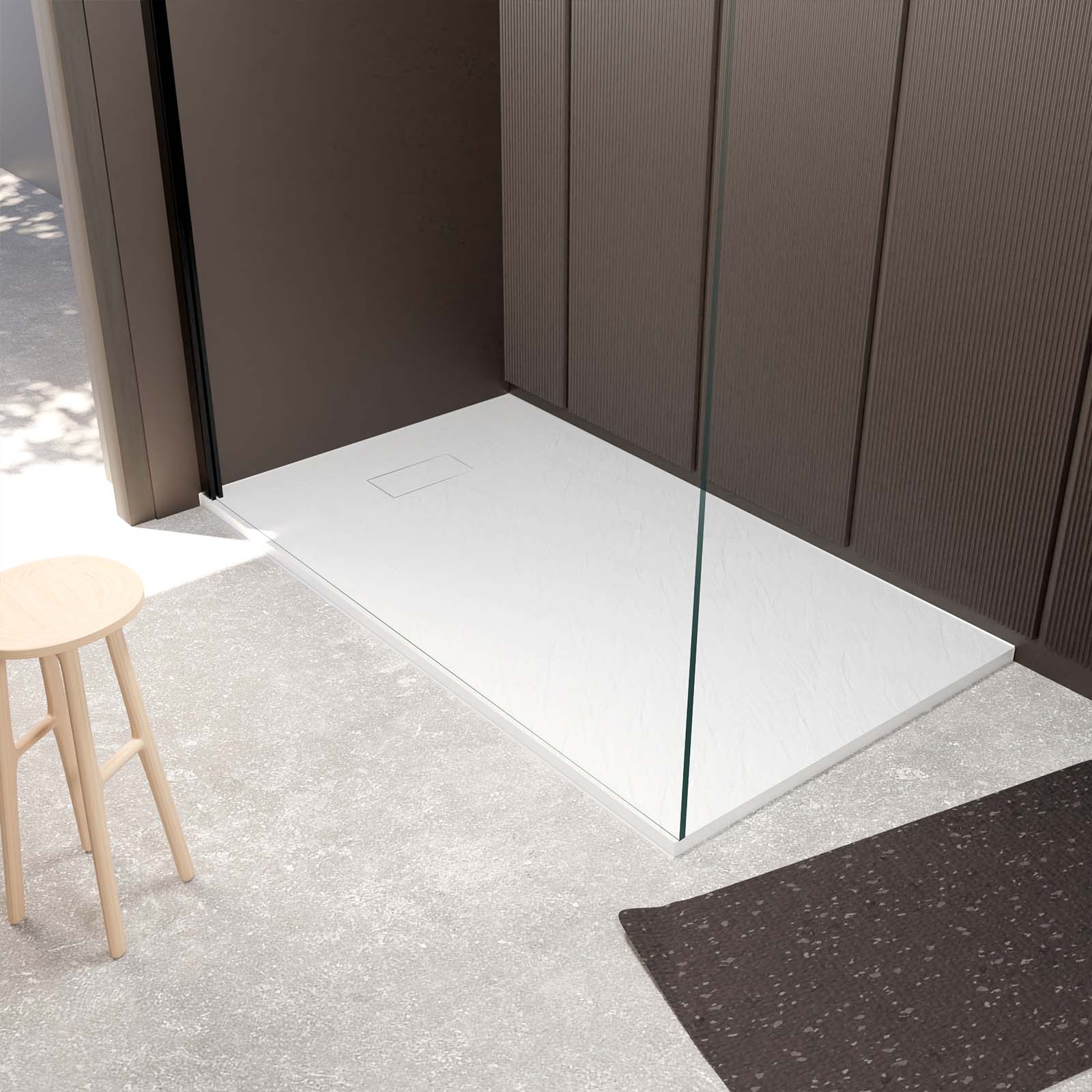 Ce receveur blanc avec un effet pierre est idéal pour votre espace douche à l'italienne.