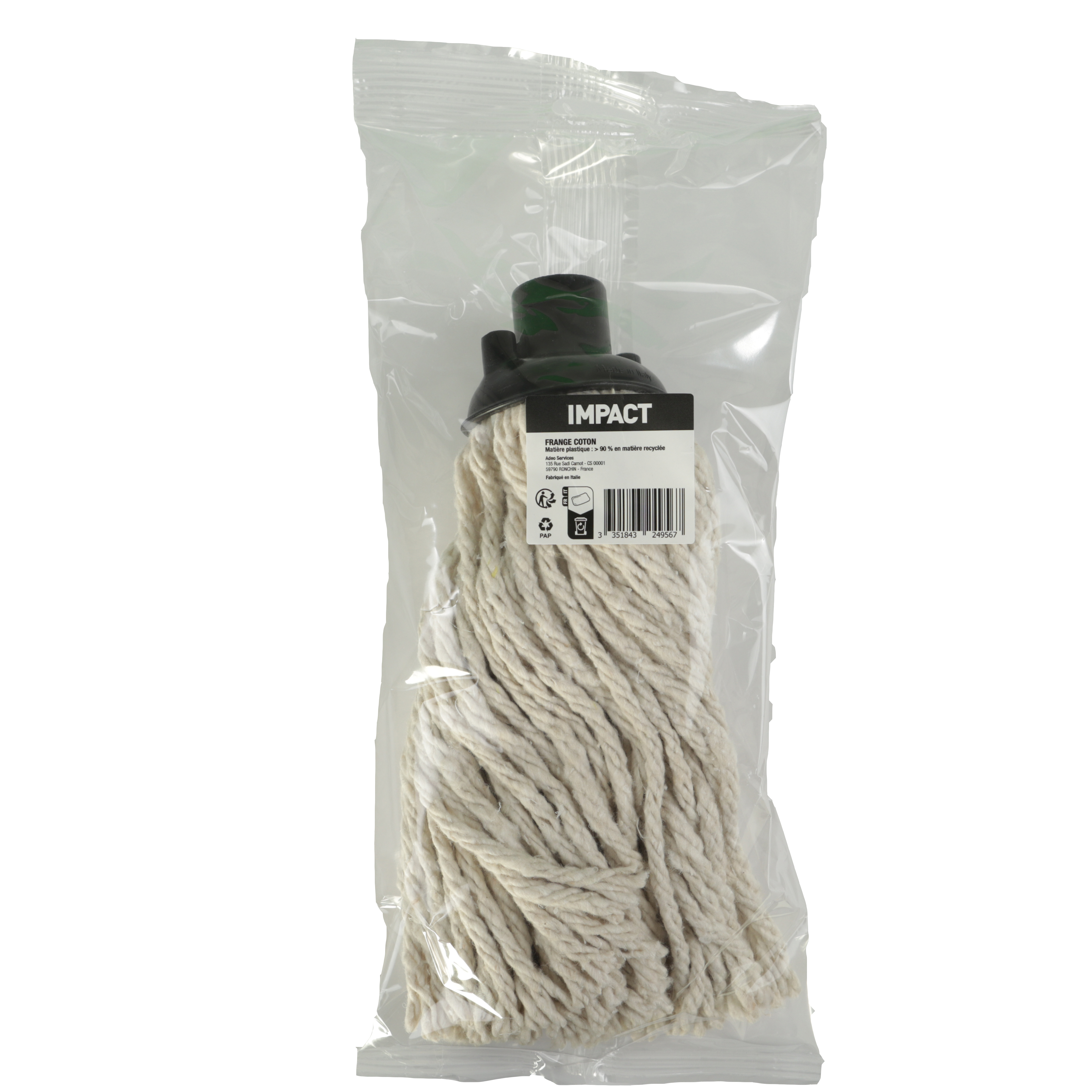 Frange coton IMPACT avec un vis français en plastique recyclé (90%) pour nettoyer les sols lisses. Le frange coton IMPACT pourra être utilisé avec chaque manche de la marque IMPACT et le seau et essoreur IMPACT