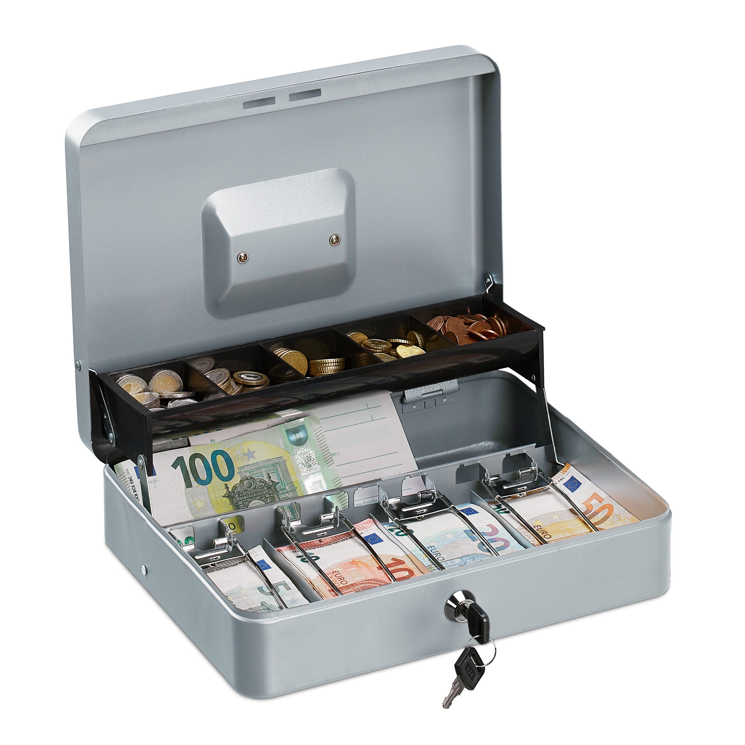 Relaxdays Caisse à monnaie, verrouillable, compartiments pour pièces et billets, fer, HLP 8,5 x 30,5 x 24,5 cm, argent