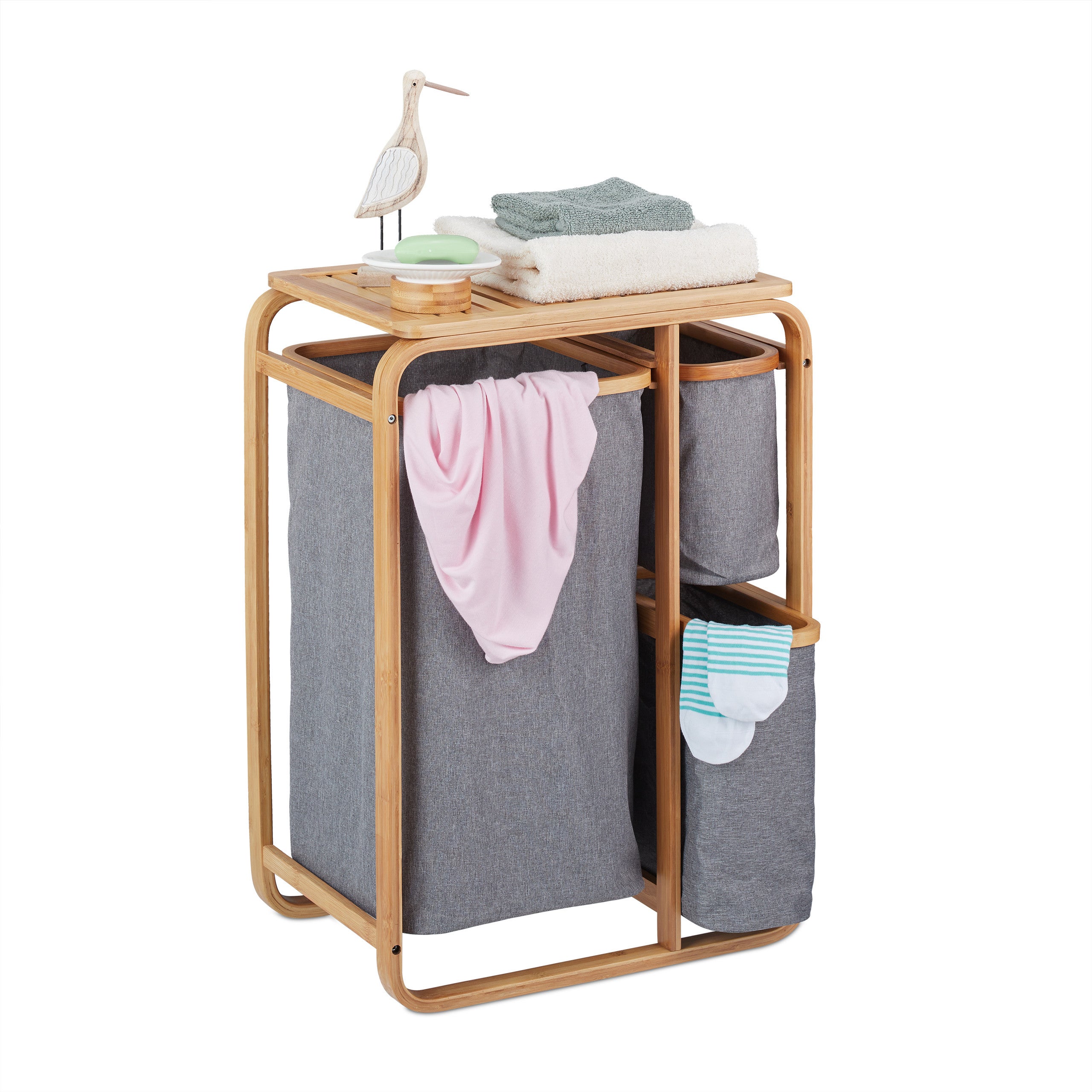 Relaxdays Meuble à linge, 3 bacs, bambou, étagère pour salle de bain avec compartiments, HLP 70x49x33,5 cm, nature/gris