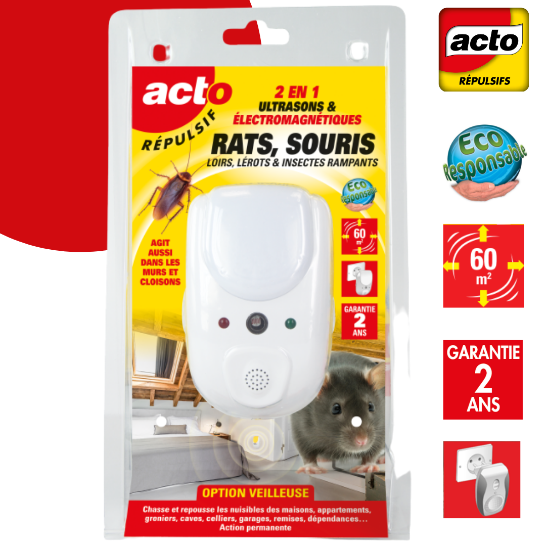 Poduit 2 en 1 : ultrason & électromagnétiques. Option veilleuse, le produit chasse et repousse les nuisibles des maisons, appartements, geniers, caves, celliers, garages, remises, dépendances…