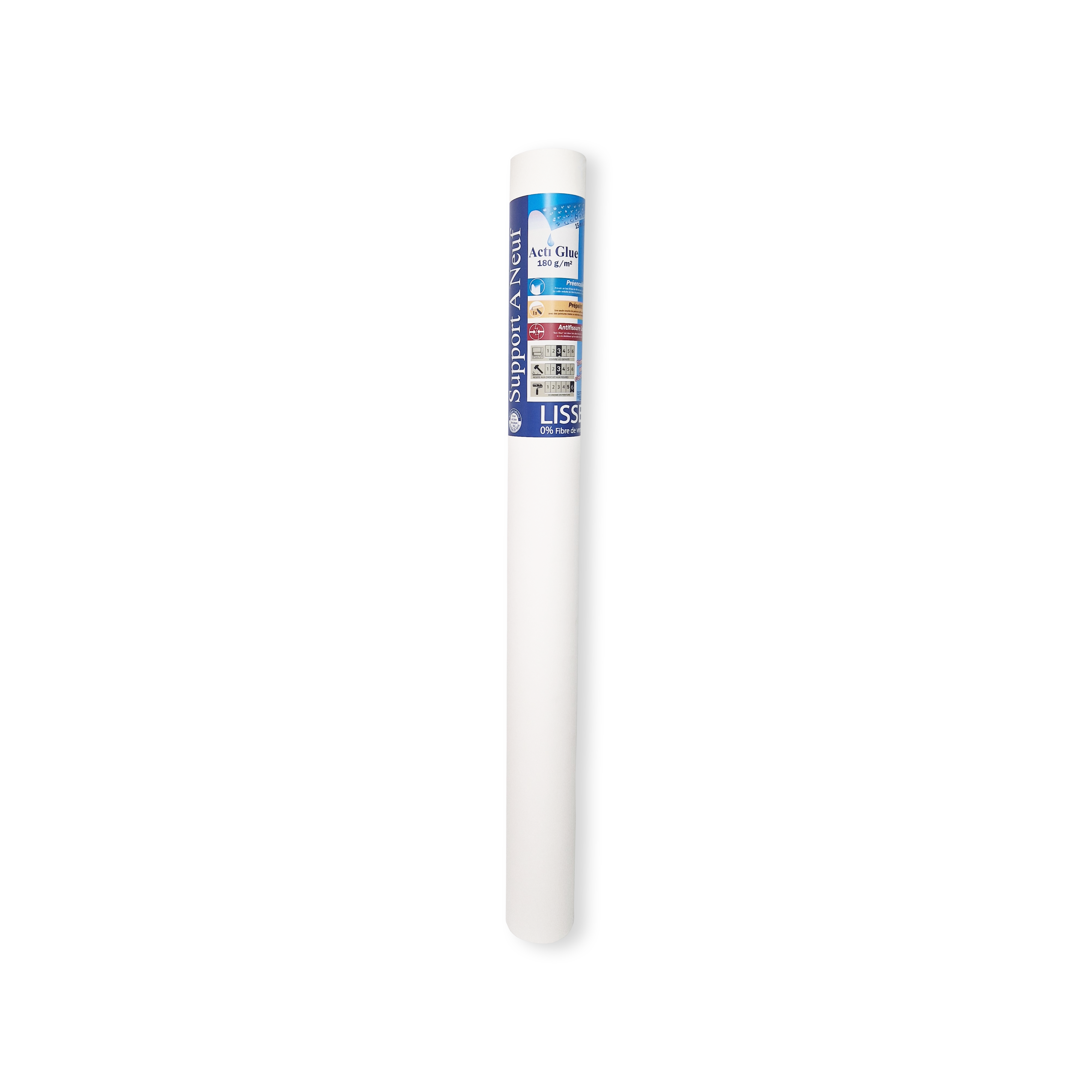 Ce revêtement intissé préencollé, prépeint et antifissures lisse va faciliter la rénovation des murs peu abimés et leur redonner un aspect lisse prêt à être peints ou tapissés. Il est préencollé : pas besoin d'appliquer de colle, il suffit de faire tremper les lés dans un bac d'eau et de les coller sur les murs. Il est prépeint : une seule couche de peinture de finition claire sera nécessaire, deux pour des coloris foncés. Enfin, Acti Glue est deux fois plus résistant aux microfissures qu'un voile de verre.