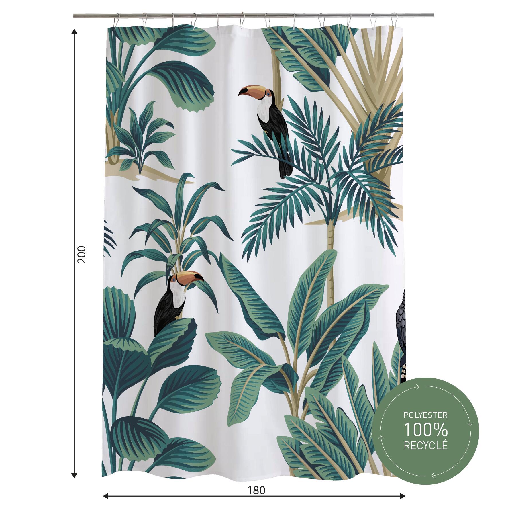 Rideau de douche HINATEA 180x200 cm en polyester recyclé AZAO Créez une ambiance exotique avec le rideau HINATEA et ses motifs végétaux luxuriants. Conçu en polyester recyclé, il est pratique, parfait pour les douches et baignoires standard avec ses dimensions de 180x200 cm.