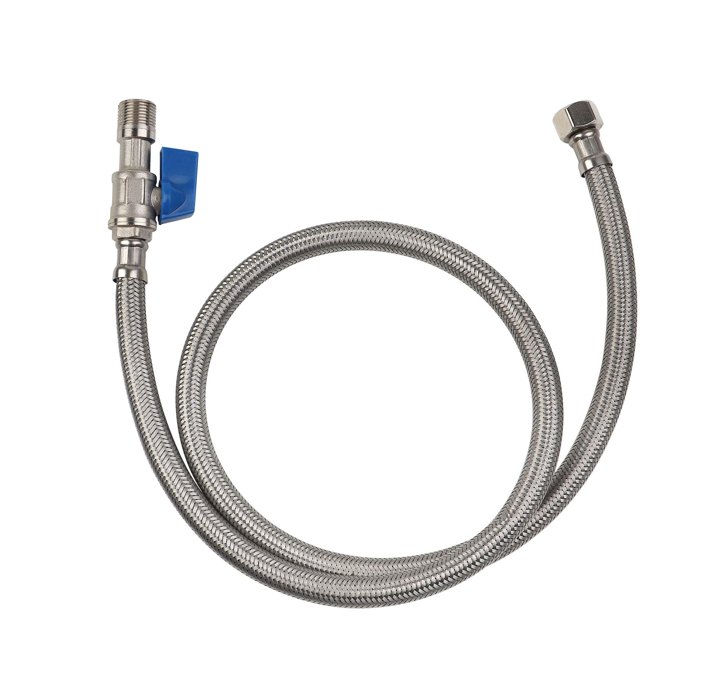 Robinet d'arrêt droit mâle 12/17 FLEXSTOP serti avec un flexible de raccordement tressé inox 100 cm - filetage Femelle écrou tournant 12/17. Ouverture et fermeture 1/4 de tour.