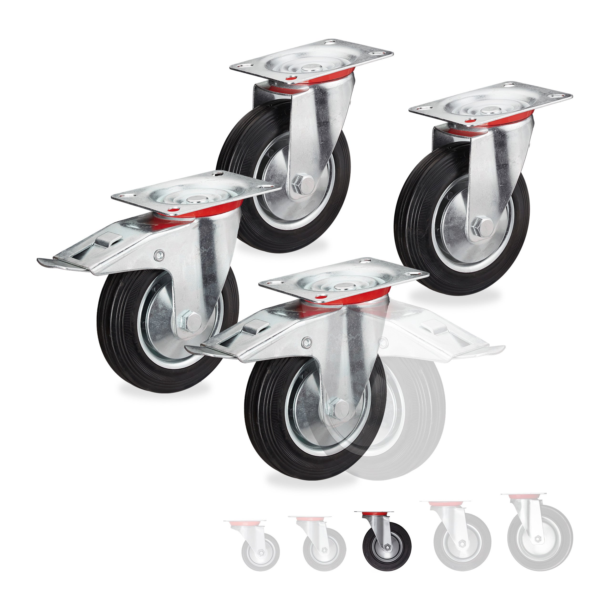 Roues charge lourde jeu de 4, pivotent à 360°, roulement à billes, 2 freins, capacité 320 kg, 125 mm, noires, Relaxdays