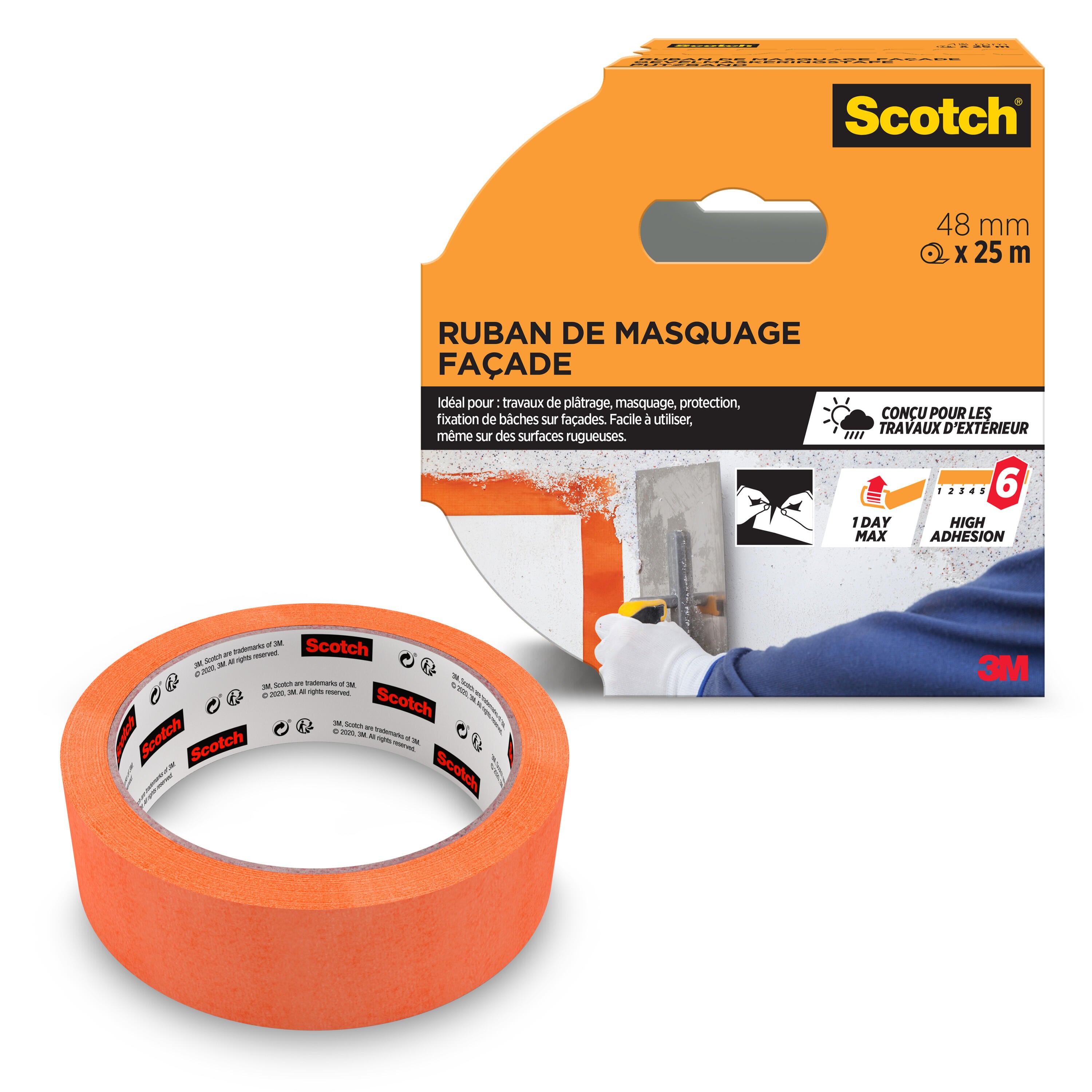 Ruban de masquage Scotch® pour extérieur 25mx48mm. Produit multi-fonctions conçu pour les travaux d'extérieur. Au pouvoir adhésif. A retirer au maximun 1 jour après application. Le ruban de masquage Scotch® pour extérieur est idéal pour les travaux de plâtrage, les façades, fixation des bâches, marquage au sol. Facile à utiliser même sur des surfaces rugueuses.