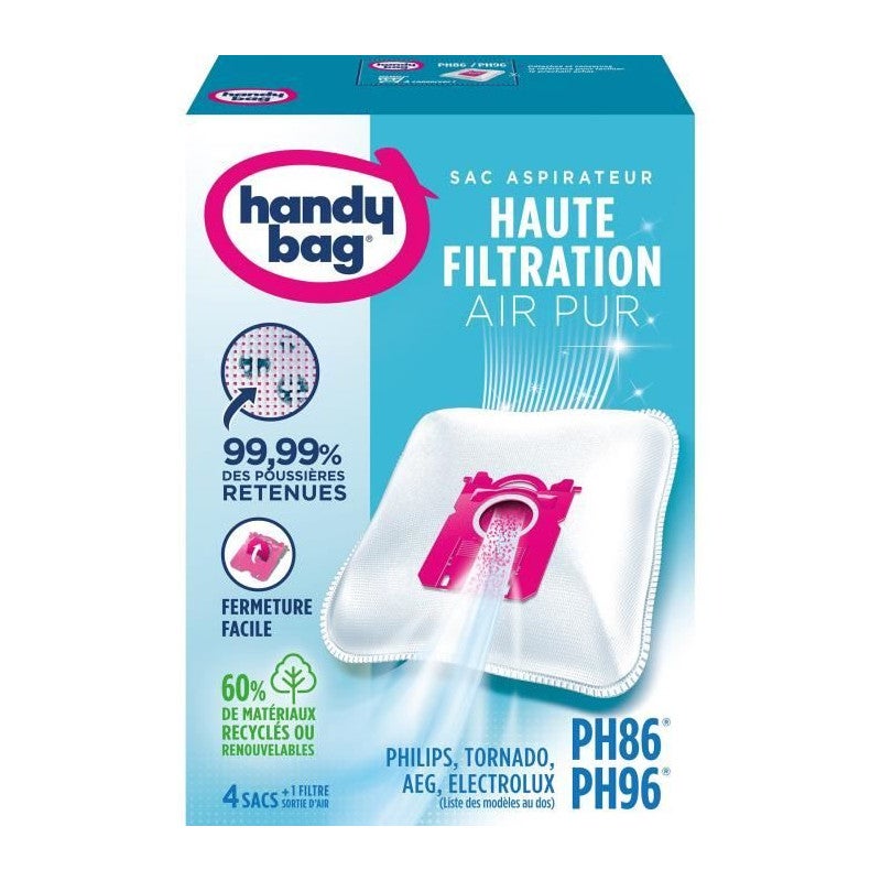 Sacs aspirateurs Handy bag PH86/PH96 - Philips, Electrolux, AEG, Tornado - 4 sacs + 1 filtre sortie d'air a découper