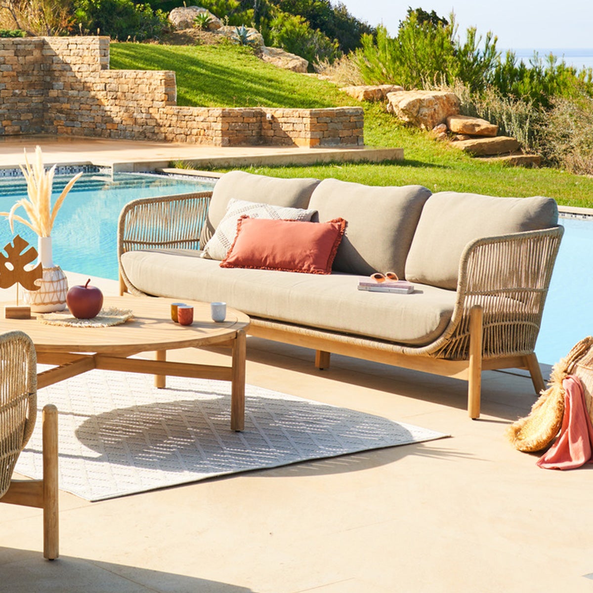 Le canapé "DEONA" possède une jolie structure en cordes avec des pieds en bois d'acacia. Très élégant, ce canapé se mariera à merveille avec une terrasse décorée avec des plantes.