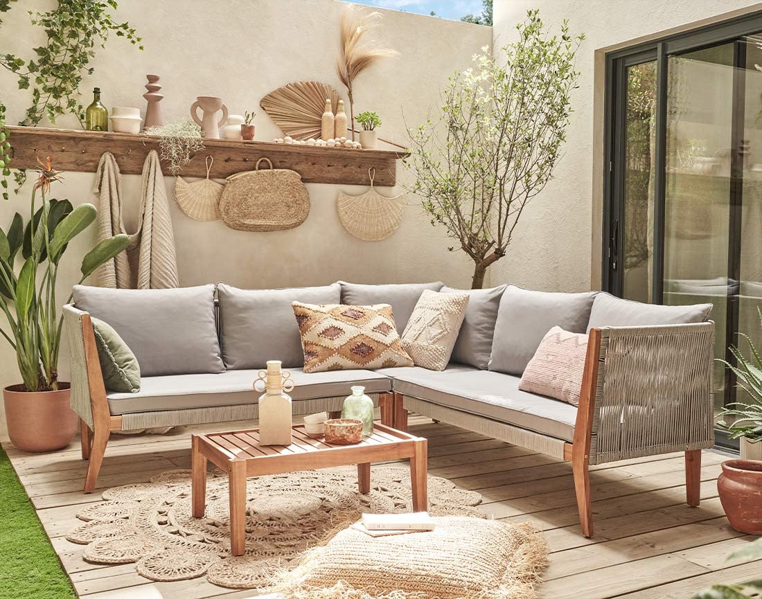 Prenez votre petit-déjeuner ou profiter d’un apéro convivial entre amis ou en famille avec le salon bas de jardin Papua. Cet ensemble de jardin en bois d’acacia et de corde est composé d’un canapé d’angle pouvant accueillir 5 personnes et d’une table basse. La table basse sera parfaite pour y déposer votre café ou votre boisson préférée ou encore de quoi grignoter tandis que le canapé d’angle vous permettra d’échanger facilement avec vos convives.