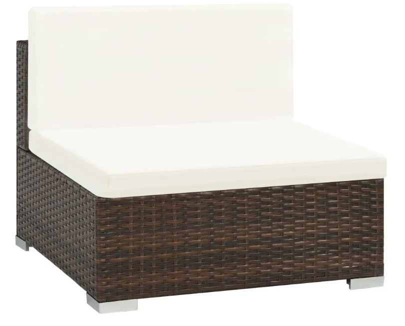 Cet ensemble de mobilier en résine tressée, comprend 2 fauteuils d'angle, 2 fauteuils centraux, 1 table basse, 2 poufs, 6 coussins de dossier et 6 coussins de siège et offrira un coin salon élégant pour votre jardin ou terrasse. L'ensemble dispose d'une structure en acier revêtu de résine tressée très résistant aux intempéries et à l'usage quotidienne. Ce modèle est également disponible avec des coussins en d'autres couleurs et en d'autres dimensions. Vous pouvez aussi découvrir d'autres ensembles de tables et de chaises qui peuvent compléter ou non ce salon pour décorer votre terrasse ou votre jardin avec harmonie. Il existe aussi d'autres ensembles de salon de jardin que vous pourrez découvrir sur notre site. Et vous pouvez aussi acheter les éléments séparément. Caractéristiques de la table basse : Dimensions : L 74 x H 26 x P 74 cm Couleur : Marron Matériau : Cadre en acier laqué + résine tressée + dessus de table en verre Caractéristiques des fauteuils : Dimensions du fauteuil d'angle : L 70 x H 54 x P 70 cm Dimensions des fauteuils de centre : L 70 x H 54 x P 70 cm Dimensions du pouf : L 70 x H 26 x P 70 cm Dimensions du siège du fauteuil d'angle : L 59 x H 26 x P 59 cm Dimensions du siège des fauteuils central : L 70 x H 26 x P 59 cm Hauteur des accoudoirs à partir du sol : 26 cm Couleur : Marron Matériau : Cadre en acier + résine tressée Caractéristiques des coussins : Épaisseur du coussin de dossier et de siège : 6 cm Couleur : Blanc crème Matériau du coussin : 100 % polyester