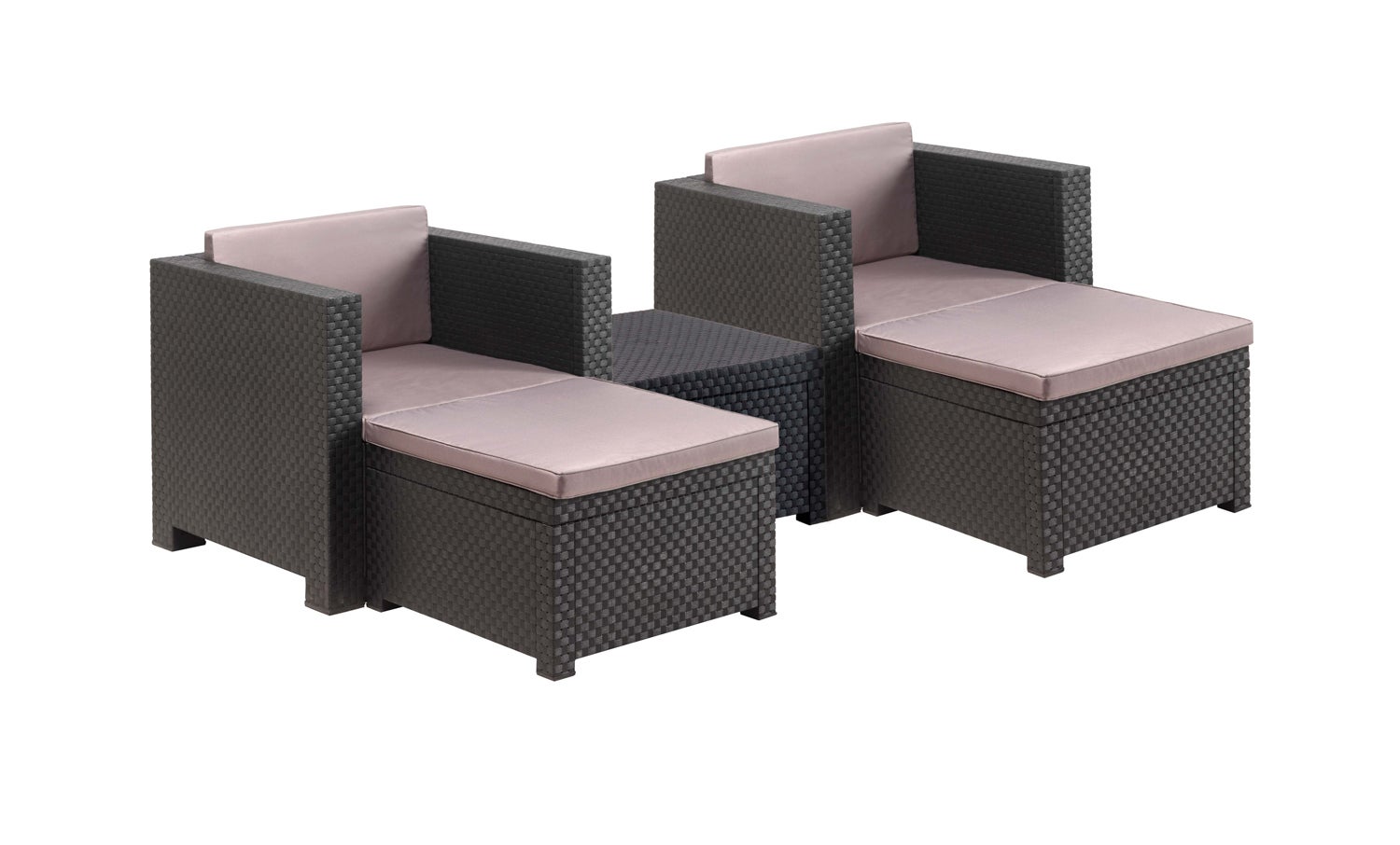Ensemble salon de jardin extérieur 4 places en résine tressée recyclée coloris anthracite se compose de : 2 fauteuils individuels avec coussins d'assise en tissu déperlant déhoussables et lavables 2 poufs (extensions de fauteuil) avec coussins 1 table basse Grande résistance aux intempéries et UV Fabriqué 100% en Espagne avec PP recyclé. Produit 100% recyclable Dimensions : Fauteuil individuel : Longueur 74 x Profondeur 66 x Hauteur 72 cm Pouf : Longueur 56 x Profondeur 56 x Hauteur 39 cm Table basse : Longueur 57 x Profondeur 57 x Hauteur 34 cm Composition du tissu : 100% polyester / 180g/m2 Garnissage des assises : 100% polyester Poids : 28 kg Matière : résine Coloris : anthracite