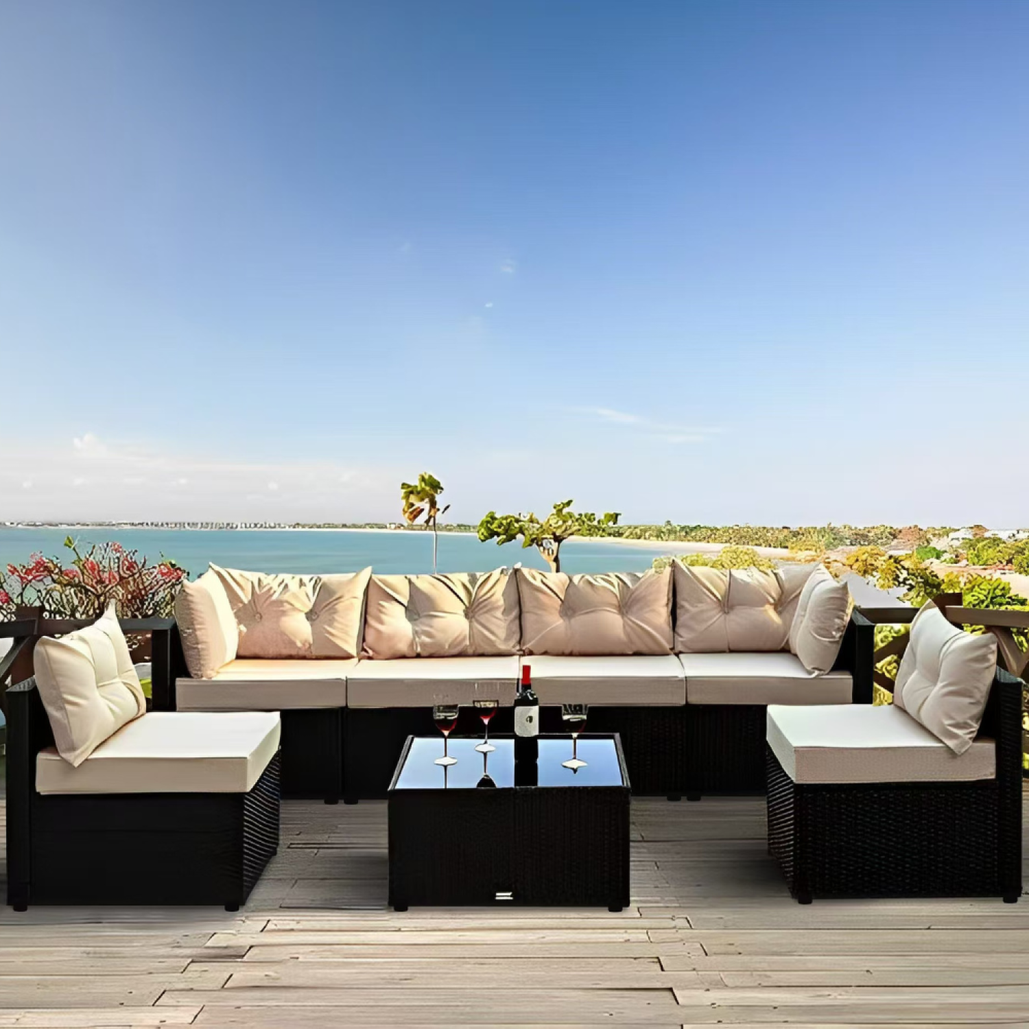 Salon de jardin modulable 6 places en résine tressée - noir Aménager un espace extérieur à la fois élégant et fonctionnel devient simple avec ce salon de jardin modulable 6 places. Pensé pour s’intégrer dans tous les styles d’extérieur, il combine une structure en résine tressée résistante avec des coussins généreux au coloris beige, pour une ambiance à la fois douce et contemporaine. L’ensemble se compose d’un sofa, de deux fauteuils d’angle et d’une table basse avec plateau en verre trempé. Chaque élément peut être déplacé à votre guise pour former un agencement en U, un salon face à face ou un angle confortable. Cette modularité vous permet d’adapter facilement votre salon de jardin selon la disposition de votre terrasse ou vos habitudes de réception. Le confort est au cœur de la conception, avec des assises épaisses et des dossiers moelleux pour une touche cosy. Les housses déhoussables facilitent l’entretien au quotidien, vous laissant pleinement profiter de vos moments en extérieur, sans contrainte. Décliné en version marron ou noire, cet ensemble s’harmonise avec de nombreux univers décoratifs, qu’il soit placé au bord d’une piscine, sur une terrasse urbaine ou dans un jardin paysager. Pratique, esthétique et accueillant, il devient rapidement un incontournable pour prolonger les beaux jours en toute sérénité. Caractéristiques techniques Nombre de places : 6 Ensemble complet de jardin composé de 4 pièces : 1 sofa, 2 éléments de fauteuils d'angle, 1 table basse. Salon de jardin modulable : en U, face à face, en angle Couleur : Noir Nombre de coussins : 8 Couleur des coussins : Beige Coussins déhoussables : Oui Type de revêtement structure : Résine tressée Type de verre : Verre trempé Entretien Utilisez un chiffon légèrement humide, pas de détergent. Dimensions Dimensions totale : 274 x 137 x 63,5 cm Dimensions table : 65 x 65 x 37,5 cm Poids table : 8,6 kg Dimensions sofa :137 x 72 x 63 cm Poids sofa : 17.3 kg Dimensions fauteuils : 65 x 72 x 63,5 cm Hauteur