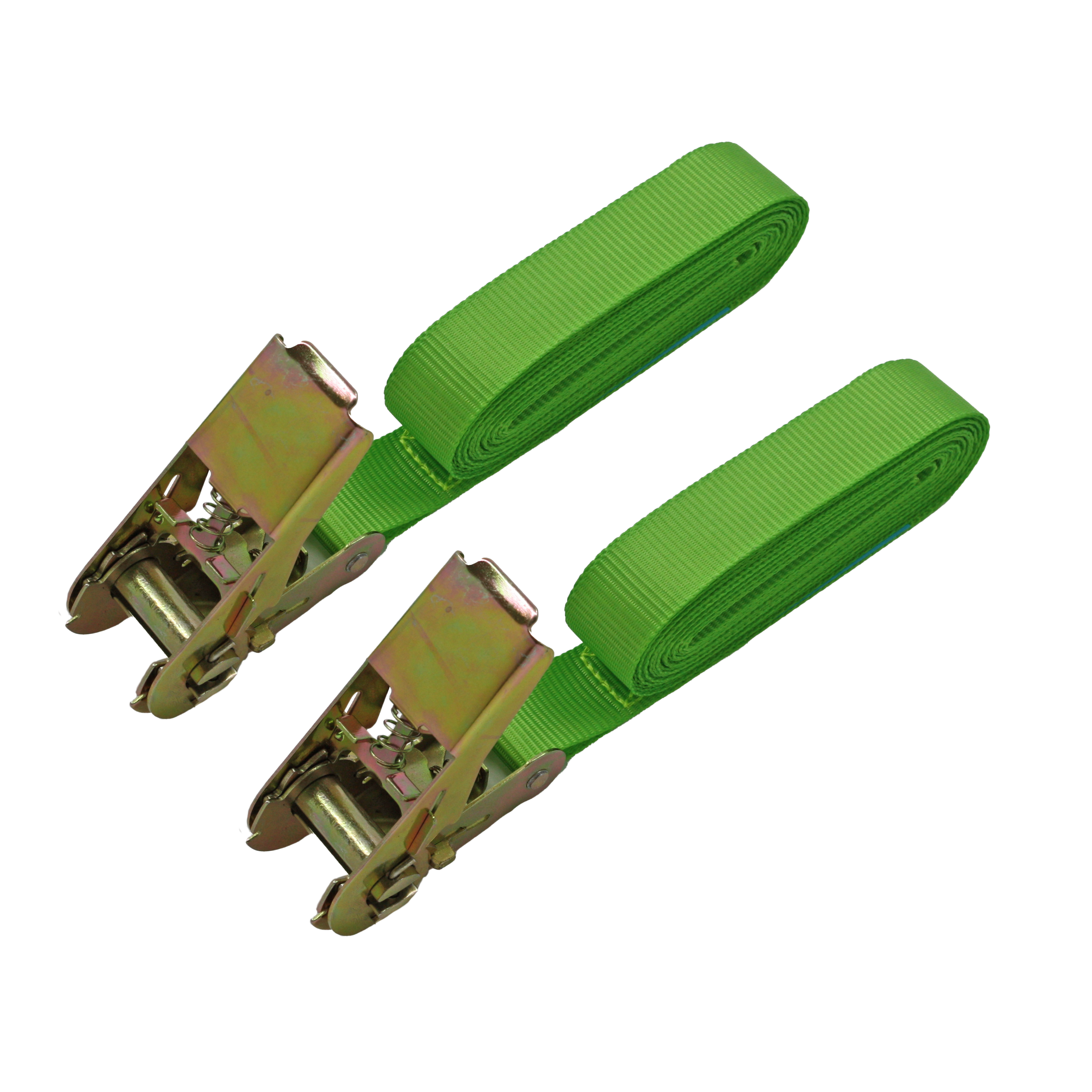 Jeu de 2 sangles de fixation Standers avec tendeur à cliquet en polyester vert et crochet en acier. Supporte une charge maximale de 500 kg. Dimensions : 5 m de long x 25 mm de large.