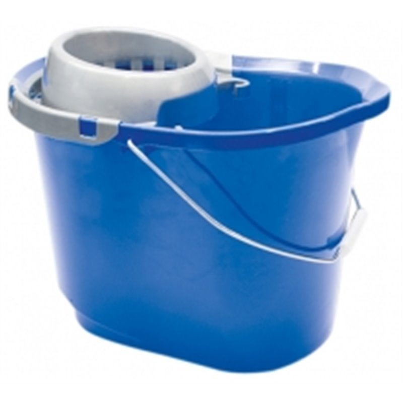 En plastique, grande résistance, avec bec verseur et anse métallique. Graduation intérieure. Crochets accroche-balais sur l'essoreur.