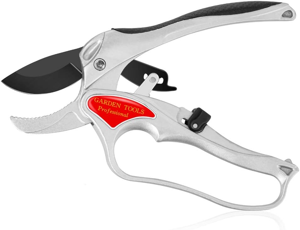 Ratchet Sécateurs: Les réglages du mécanisme de rattrapage multiplient la puissance de votre main, il clique et se déplace au prochain réglage après chaque pression pour augmenter la pression pendant que vous coupez afin que vous ne deviez pas faire le travail - les cisailles d'élagage le font pour vous.