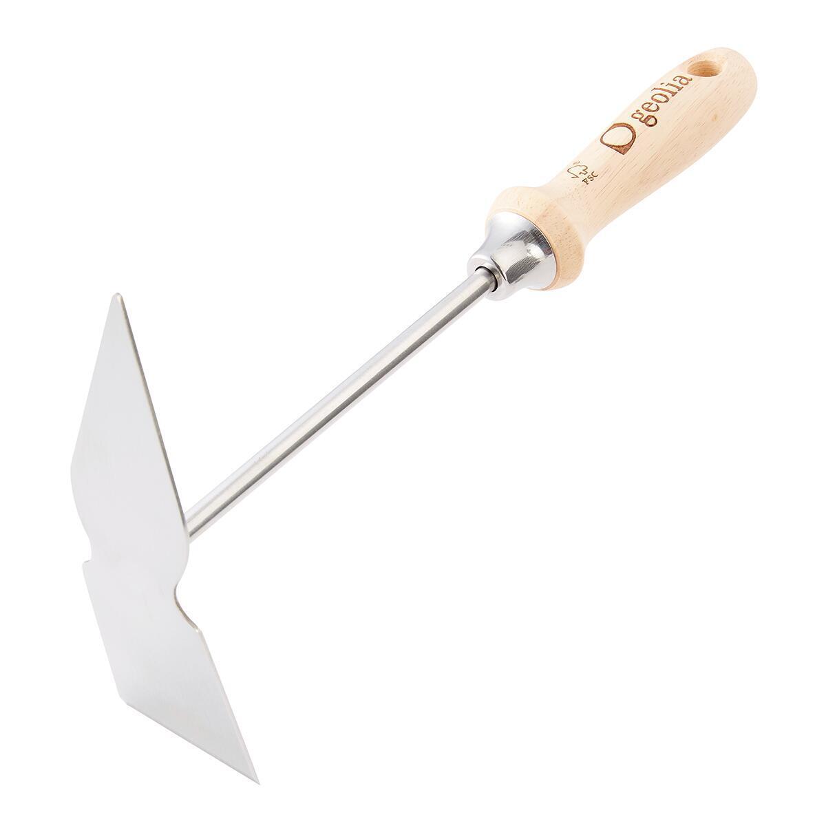 Houe plate Geolia, en acier inoxydable avec un manche ergonomique en bois qui rend le travail du jardin plus confortable. Il possède le label FSC, qui certifie que le bois provient de forêts gérées de manière durable. Dimensions : 12,3 x 32 cm (largeur x longueur).