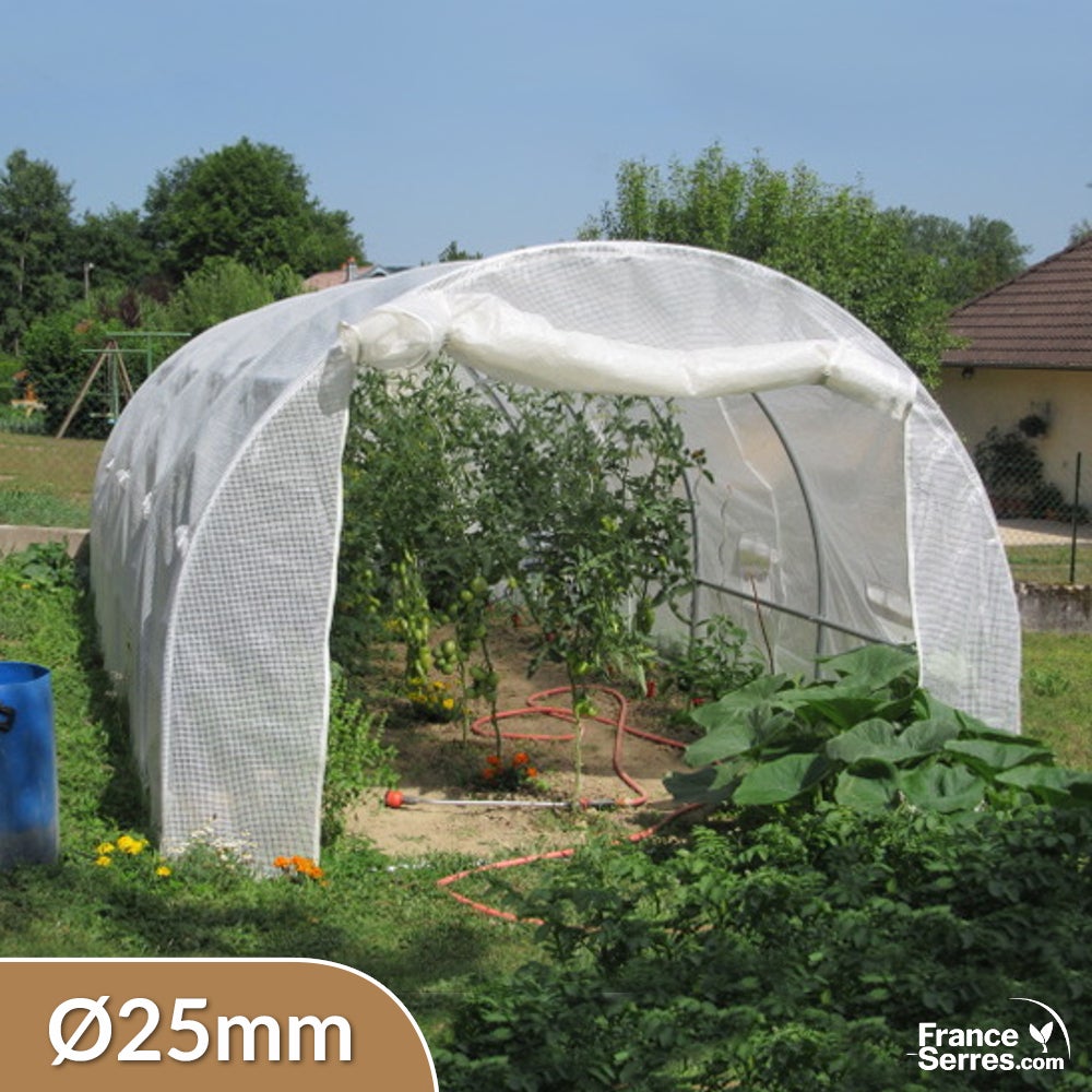 Cette serre tunnel de 18m² se distingue par une structure renforcée en acier galvanisé d'un diamètre de 25mm. Elle est équipée d'une bâche de 200g/m² dite "armée" en polyéthylène avec un maillage de fils en nylon blanc. Sa couleur blanche s'accordera parfaitement avec l'univers de votre jardin tout en offrant un véritable gain de luminosité. Equipée de 8 fenêtres avec rabats munies de moustiquaires et d'une porte de 1m65, la serre tunnel 18m² blanche vous offrira une aération efficace de vos cultures et un passage aisé de votre matériel encombrant ! Vous pourrez y cultiver facilement vos plants de tomates et tous vos autres légumes en les protégeant des conditions météorologiques et des nuisibles.