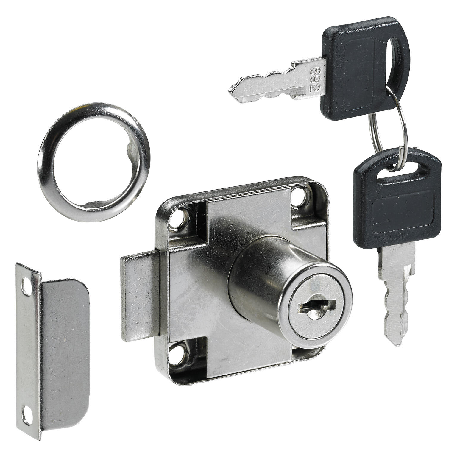 Serrure de meuble en acier nickelé avec cylindre de 18mm et cache de 25mm. Pour des épaisseurs de porte de 13 à 20mm. Possibilité d'utilisation pour tiroirs et abattants