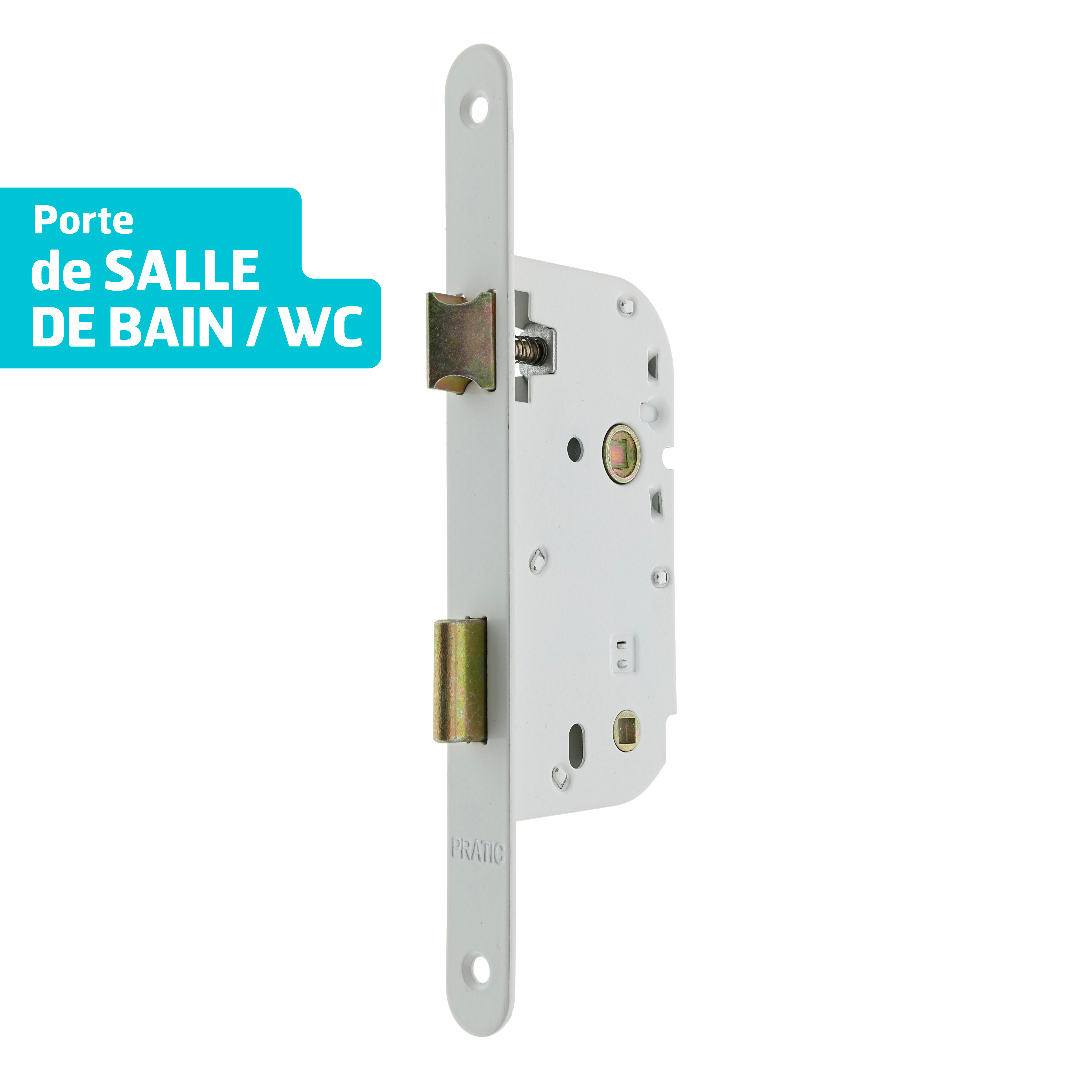 Serrure axe 50 mm pour porte de salle de bains, toilettes (bec de cane à condamnation). - Coloris blanc - Pêne dormant ½ tour - Entraxe 70 mm – Carré de 7 mm - Coffre et pêne dormant en acier (1 tour) - Têtière acier laqué à bouts ronds - Réversible droite/gauche sans outil - Livrée avec vis de fixation