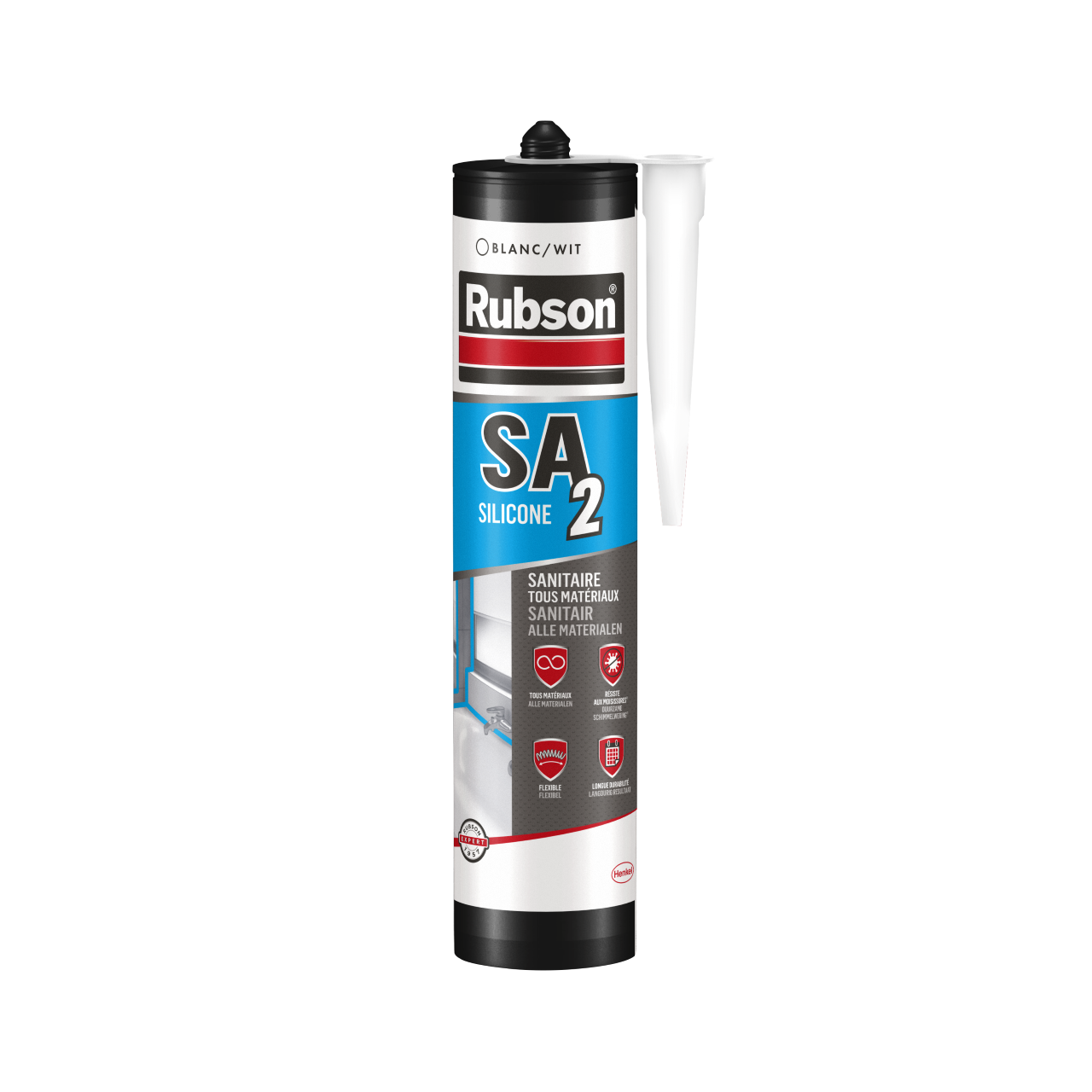 Rubson SA2 Sanitaire 2 en 1 est un mastic silicone anti-moisissures utilisable sur tous matériaux en émail et synthétiques. Ce mastic contient de puissants antifongiques, il est idéal pour la réalisation de joints d’étanchéité des douches, baignoires, bondes, de joints de raccordement entre carrelage et murs, sols et meubles encastrés de cuisine ou salle de bain (mélaminé, postformé, etc.) et de joints de finition des panneaux de cloison (salles climatiques, etc.). Il s'utilise sur tous les matériaux non poreux et vitrifiés, mais aussi sur les matériaux synthétiques ou acryliques : tôle émaillée, verre, grès, porcelaine, etc. Il est résistant aux variations de températures (-50°C à +150°C), ne rétrécit pas, il est très élastique et certifié SNJF sanitaire. Ce mastic est idéal pour les professionnels. Cette cartouche délivre environ 11m de cordon. Le séchage à cœur se fait en 48h.