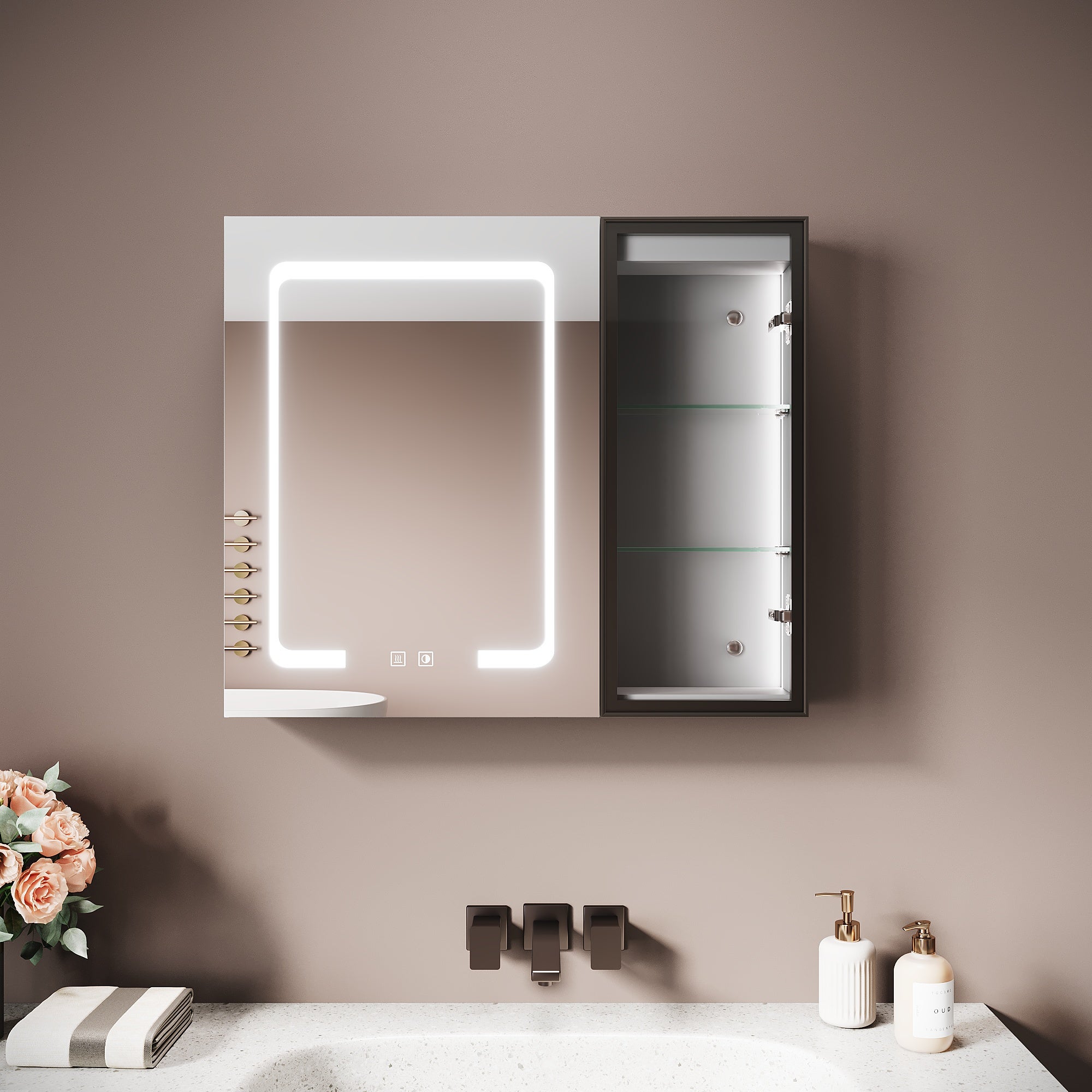 SIRHONA Armoire Miroir Salle de Bain 70x60x13cm avec Porte Vitrée, Miroir Anti-Buée Localisée 3 Lumières et Étagère Verre avec Prise - Gris Maroc