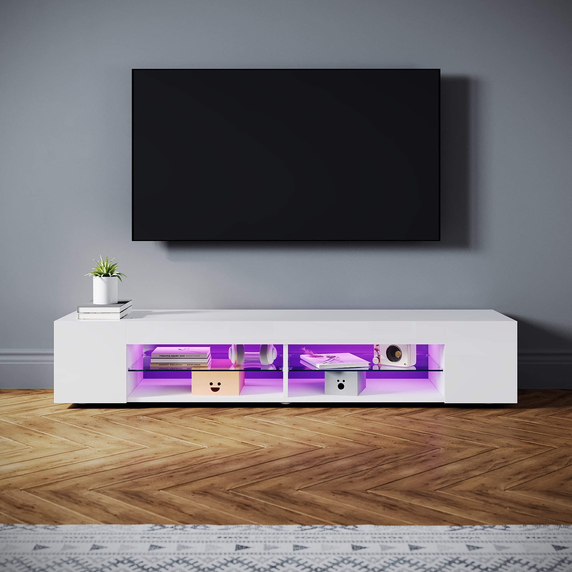 SIRHONA Meuble TV LED Moderne Demi-ouvert Placer Space + Verre Stratifiée + Blanc + 160cm
