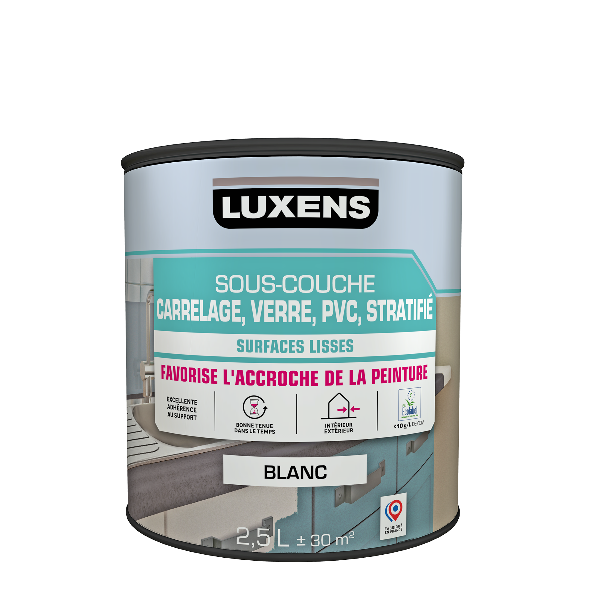 En savoir plusCette sous-couche carrelage, verre, PVC, stratifié, mélaminé LUXENS, à base de résine acrylique est idéale pour préparer vos surfaces lisses intérieures et extérieures avant peinture. Cette peinture d'impression a une excellente adhérence à ces supports,. Grâce à sa formule, elle favorise l'accroche et la durabilité des peintures de finition. Toutefois, il est déconseillé de l’appliquer à l’intérieur d’une cabine de douche. Notre sous-couche Luxens est Ecolabel, ce label certifie les produits pour leurs performances techniques, leur quantité limitée en substance dangereuse et leur faible taux en composés organiques volatiles, inférieur à 10g/l de COV.