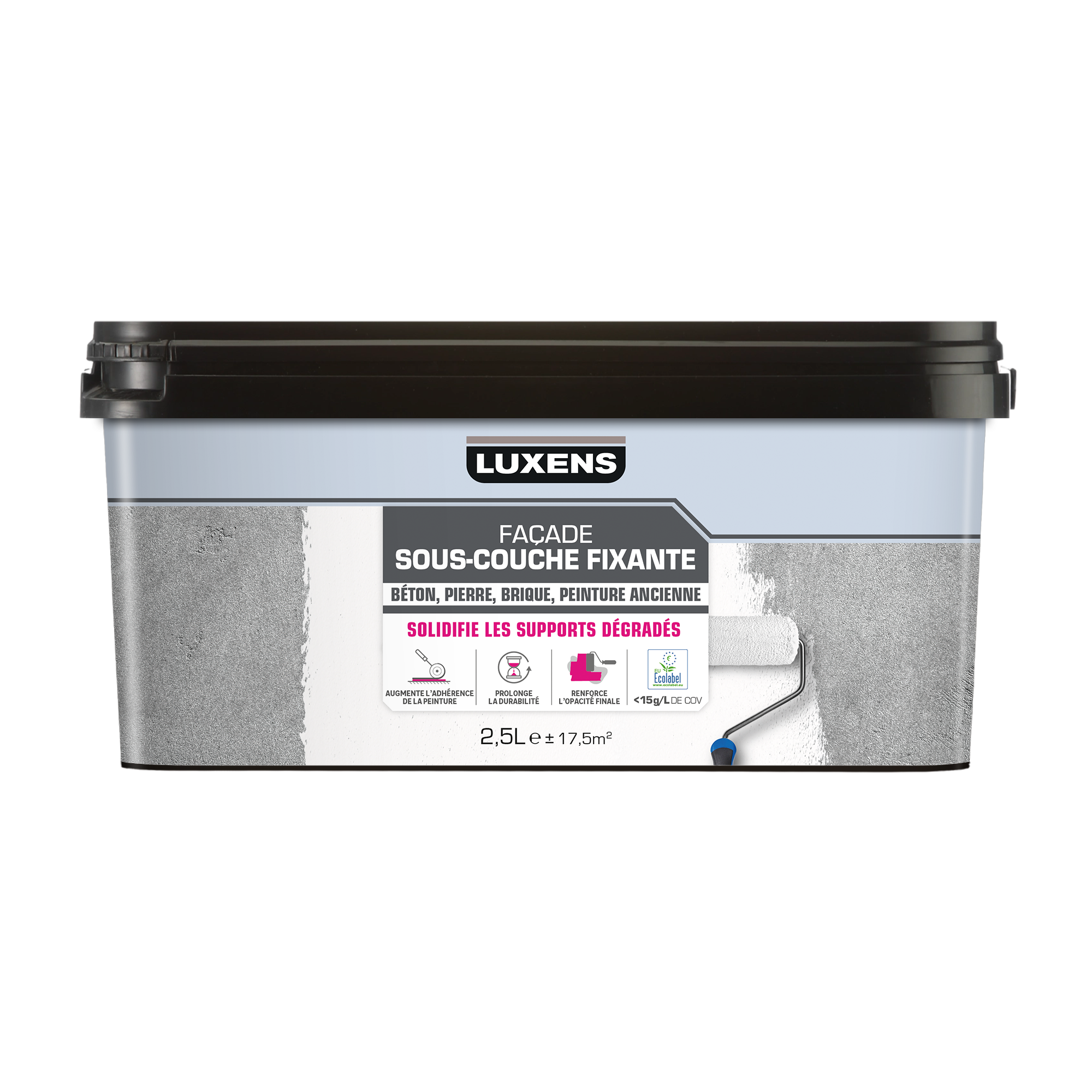 En savoir plusSous-Couche Façade Fixante LUXENS à utiliser en préparation des façades et murs extérieurs neufs ou anciens. Grâce à sa formulation, cette peinture d'impression solidifie les supports dégradés (fonds fragiles, friables, absorbants ou poreux) et augmente l'adhérence des peintures et crépis extérieurs. Sa texture uniformise les surfaces en masquant taches et imperfections pour une opacité finale renforcée. Prolonge la longévité des peintures et crépis pour un résultat durable. Facile d'application et sans projection. Nettoyage des outils à l'eau. Notre peinture Luxens est Ecolabel, ce label certifie les produits pour leurs performances techniques, leur quantité limitée en substance dangereuse, et leur faible taux en composés organiques volatiles, inférieur à 15g/l de COV.