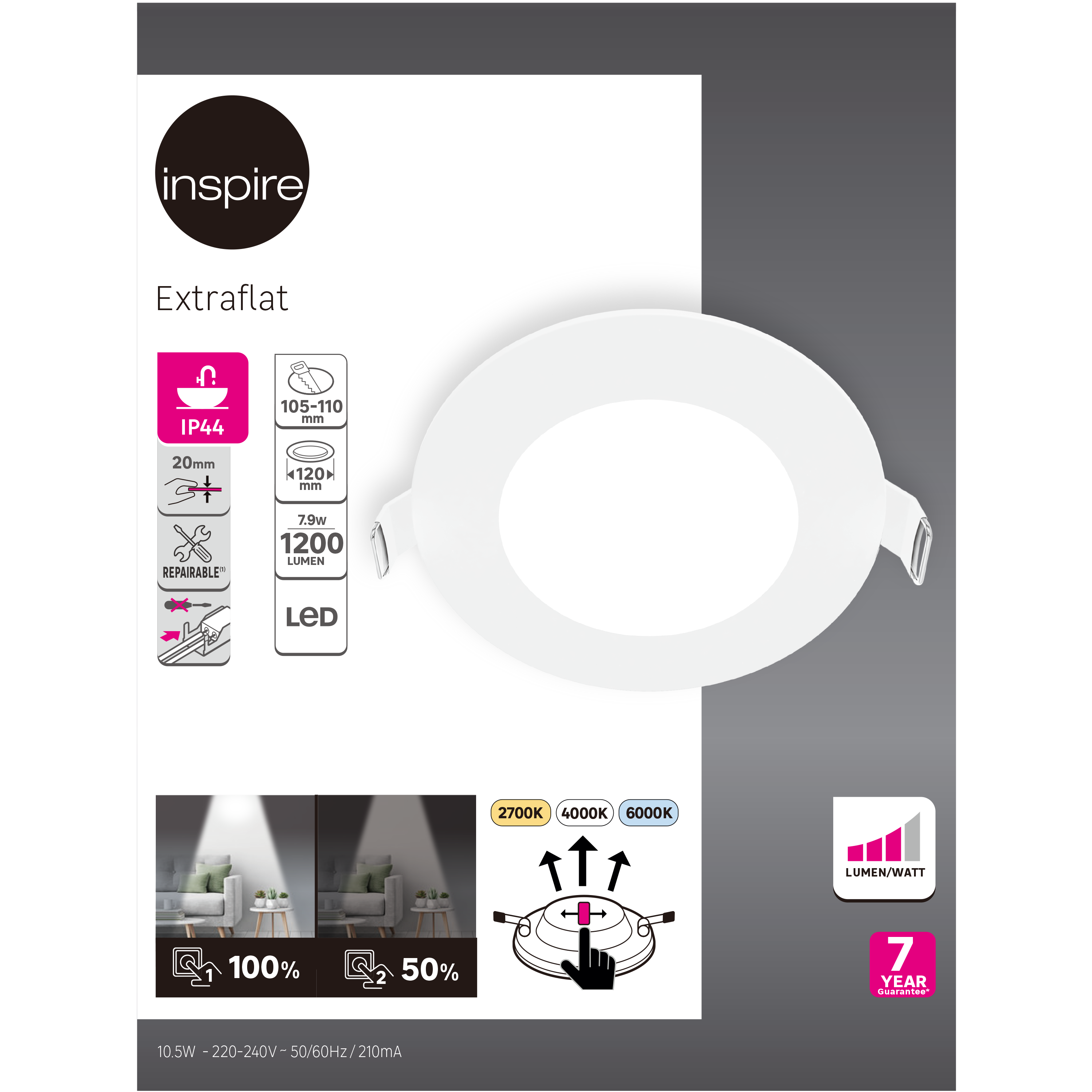 Ce spot à encastrer LED "Extraflat", de 12 cm de diamètre, en coloris acier, et au design sobre et élégant, s’harmonisera avec différents styles d'intérieurs et éclairera vos pièces à vivre comme votre salon, cuisine ou couloir par exemple, et même dans votre salle de bains grâce à son indice de protection IP44. Sa faible hauteur d’encastrement permet l'installation dans des plafonds à faible hauteur d'encastrement (à partir de 5 cm). Lors de l’installation, vous pourrez choisir la température lumineuse adaptée à vos besoins : 2700 kelvins pour un environnement chaleureux et cosy, 4000 kelvins pour un blanc neutre ou 6000 kelvins pour un rendu lumineux fonctionnel. En utilisant votre interrupteur mural actuel (pas besoin d’acheter un interrupteur spécifique), l’intensité de la lumière peut passer de 100% à 50% d’intensité. Une bonne façon d’économiser l’énergie ! En effet, elle vous permet de réduire votre consommation d’électricité, votre facture d’électricité et votre empreinte carbone. Ce spot Extraflat est disponible en plusieurs tailles et finitions. La marque Inspire a rendu le produit réparable avec une garantie de 7 ans. Vous pouvez contacter le service après-vente de votre boutique pour plus d’informations