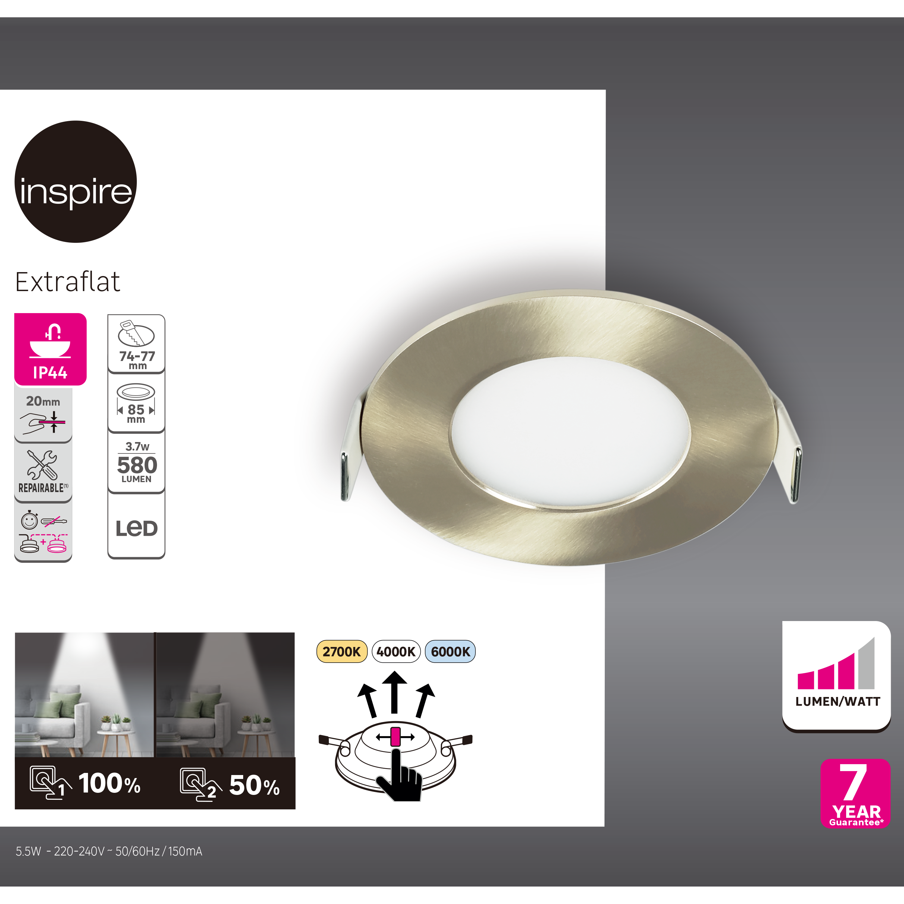 Ce spot à encastrer LED "Extraflat", de petit diamètre (8,5 cm), en coloris acier, et au design sobre et élégant, s’harmonisera avec différents styles d'intérieurs et éclairera vos pièces à vivre comme votre salon, cuisine ou couloir par exemple, et même dans votre salle de bains grâce à son indice de protection IP44. Sa faible hauteur d’encastrement permet l'installation dans des plafonds à faible hauteur d'encastrement (à partir de 5 cm). Lors de l’installation, vous pourrez choisir la température lumineuse adaptée à vos besoins : 2700 kelvins pour un environnement chaleureux et cosy, 4000 kelvins pour un blanc neutre ou 6000 kelvins pour un rendu lumineux fonctionnel. En utilisant votre interrupteur mural actuel (pas besoin d’acheter un interrupteur spécifique), l’intensité de la lumière peut passer de 100% à 50% d’intensité. Une bonne façon d’économiser l’énergie ! En effet, elle vous permet de réduire votre consommation d’électricité, votre facture d’électricité et votre empreinte carbone. Ce spot Extraflat est disponible en plusieurs tailles et finitions. La marque Inspire a rendu le produit réparable avec une garantie de 7 ans. Vous pouvez contacter le service après-vente de votre boutique pour plus d’informations