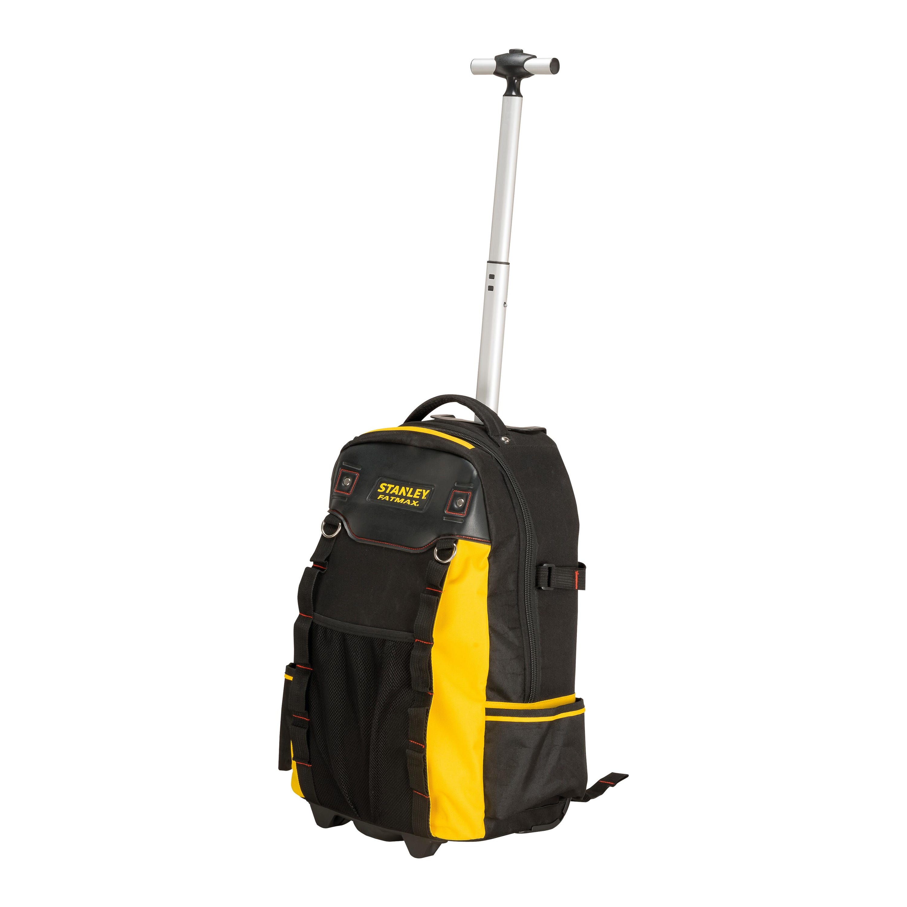 Sac à dos Fatmax à roulettes en tissu renforcé noir, conçu pour organiser et transporter vos outils. D'une capacité totale de 30 litres, il intègre différents compartiments pour garder tous vos outils accessibles et éviter qu'ils ne se mélangent avec les machines, les vis, les papiers, etc. Grâce à son système de poignée télescopique, vous pouvez le transporter confortablement où que vous alliez, comme un trolley. Dimensions : 23 x 50 x 42 cm (largeur x hauteur x longueur).