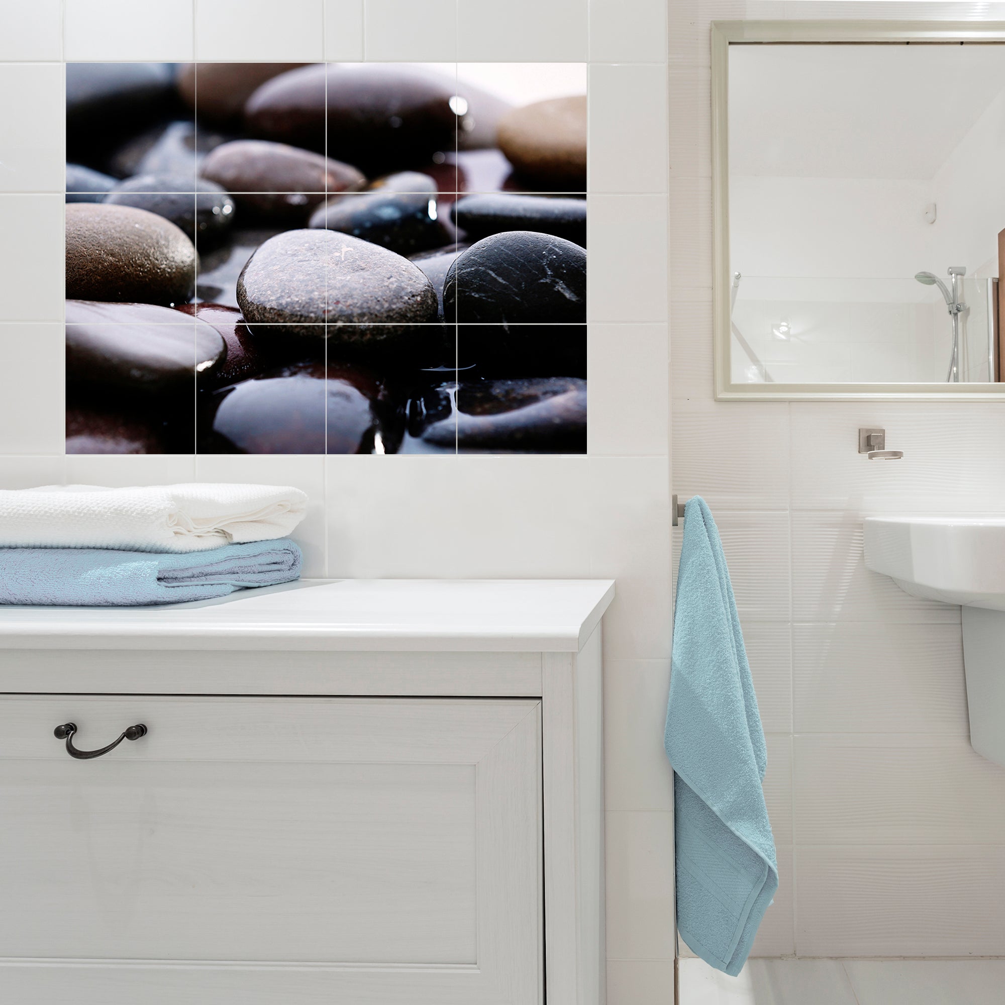Sticker adhésif homestaging, galets posés sur un couleur d'eau, thème nature et fraîcheur, x12, 15 cm X 15 cm