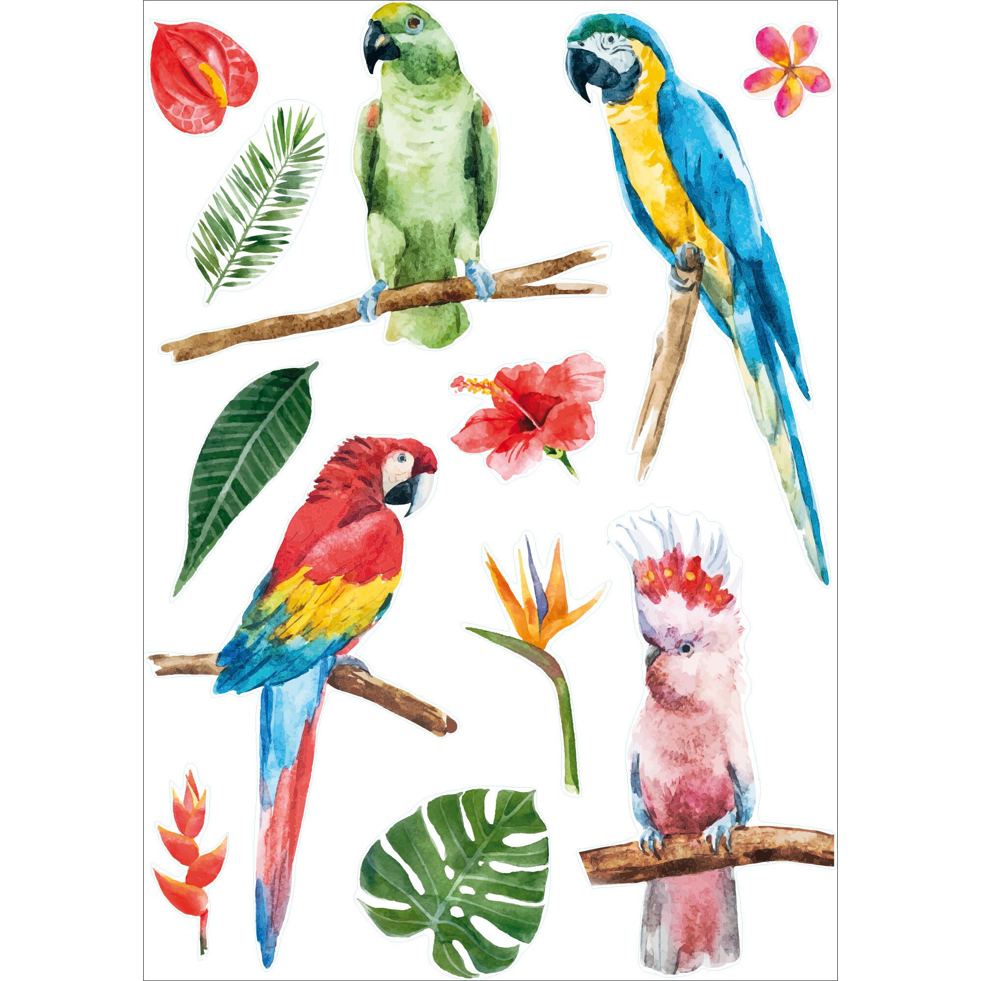 Sticker adhésif motif perroquets du Brésil, planche d’une largeur de 48 cm et hauteur 68 cm.