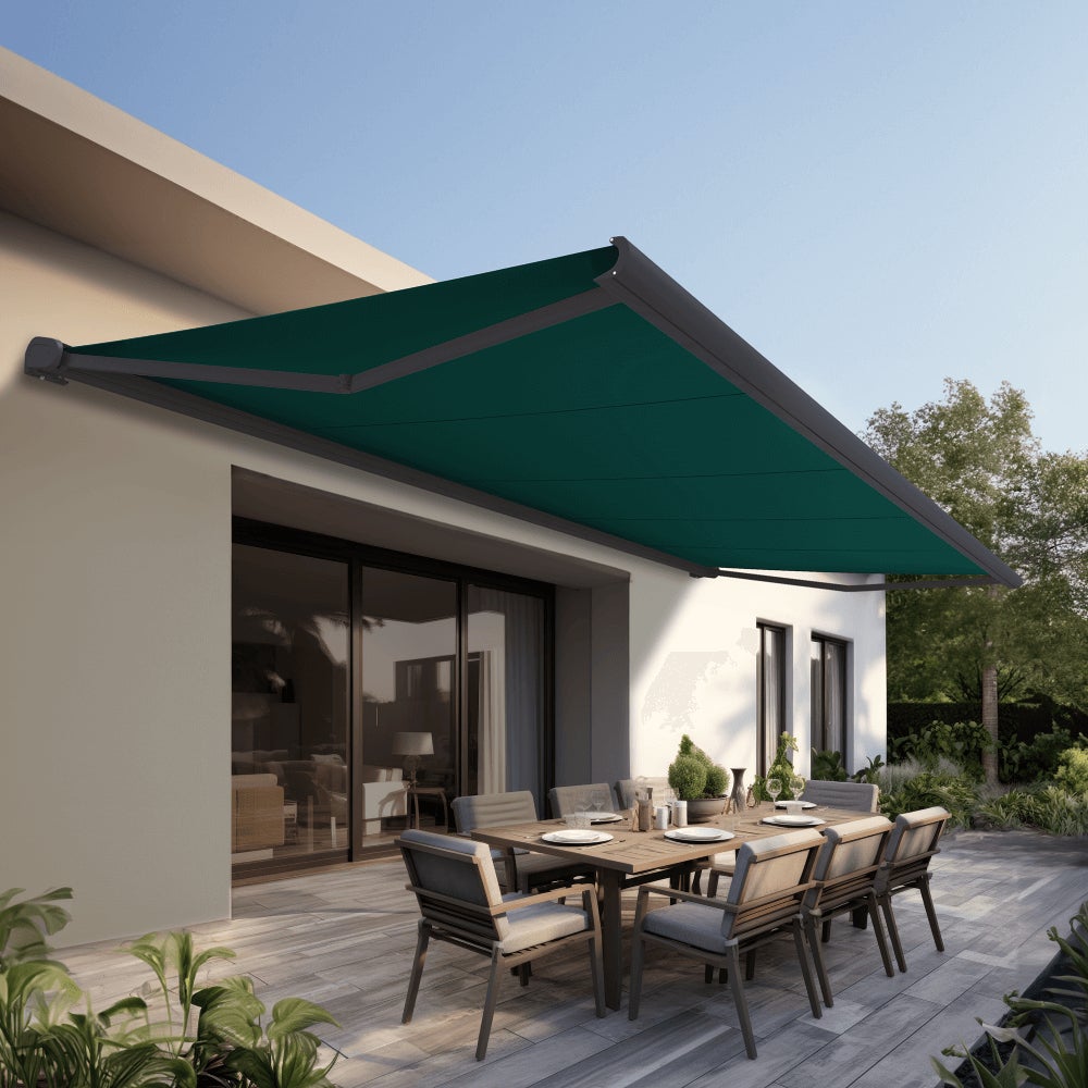 Store banne Coffre intégral PROTECT 2 LED SMART Gris Anthracite 5x3,5m Motorisé à télécommande + Capteur Vent + Eclairage LED - Toile Verte