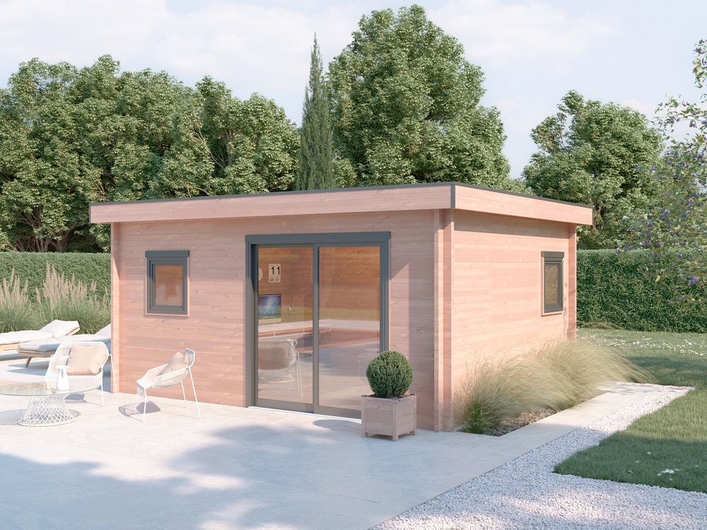 Studio de jardin NANTUA 20m² - Bois Douglas épaisseur 55mm - Baie vitrée Alu & Fenêtres PVC GROSFILLEX - Toiture Bacacier avec voliges
