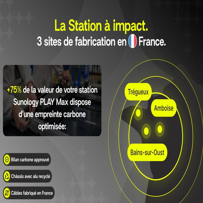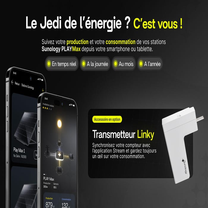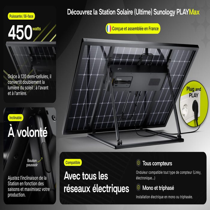 Cette entreprise 100 % française innovante a été créée à Nantes et produit ses panneaux solaires en Bretagne. La station solaire Sunology PLAY Max est la 1ère station solaire la plus innovante jamais conçue avec Batterie. Désormais, le photovoltaïque alimente votre foyer le jour et la nuit ! Elle est facile à installer et se branche directement sur une prise 220V, offrant ainsi la possibilité de produire de l'électricité verte, que l'on habite un appartement ou une maison, que l'on soit propriétaire ou non, et que l'installation électrique soit monophasée ou triphasée. Préparez-vous à une expérience d’autoconsommation et d’autonomie énergétique inouïe.