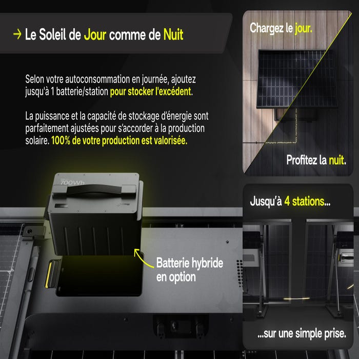 EN OPTION, AJOUTER UNE BATTERIE MODULAIRE DE 700Wh POUR STOCKER VOTRE ÉNERGIE PRODUITE : Vous pouvez à tout moment ajouter une batterie à votre Station PLAY Max pour obtenir une solution de stockage 100% adaptée à vos besoins et votre budget. Si elle fait la taille d’une bouteille d’eau d’1L, la batterie de PLAY Max peut emmagasiner pas moins de 700Wh - soit 5 heures de solaire en plus, toutes les nuits. Avec une batterie par panneau, la puissance et la capacité de stockage d’énergie sont parfaitement ajustées pour s’accorder à la production solaire. 100% de votre production est valorisée.