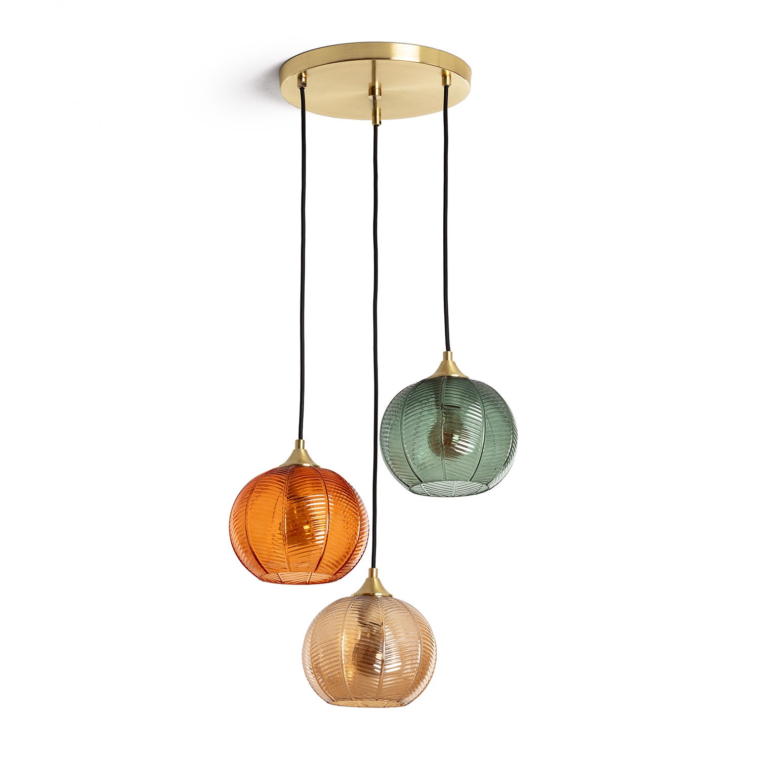 Caractéristiques de la Suspension Verre Tri KlimtLa Suspension Verre Tri Klimt est composée d'un fleuron métallique en finition dorée et de trois abat-jour en verre suspendus à trois câbles textiles noirs. Ses abat-jour en font la principale caractéristique de son design. Ils sont de forme sphérique avec de subtils reliefs et une combinaison de couleurs vives telles que l'orange, le bleu et le beige qui rappellent les lampes classiques des années 20.