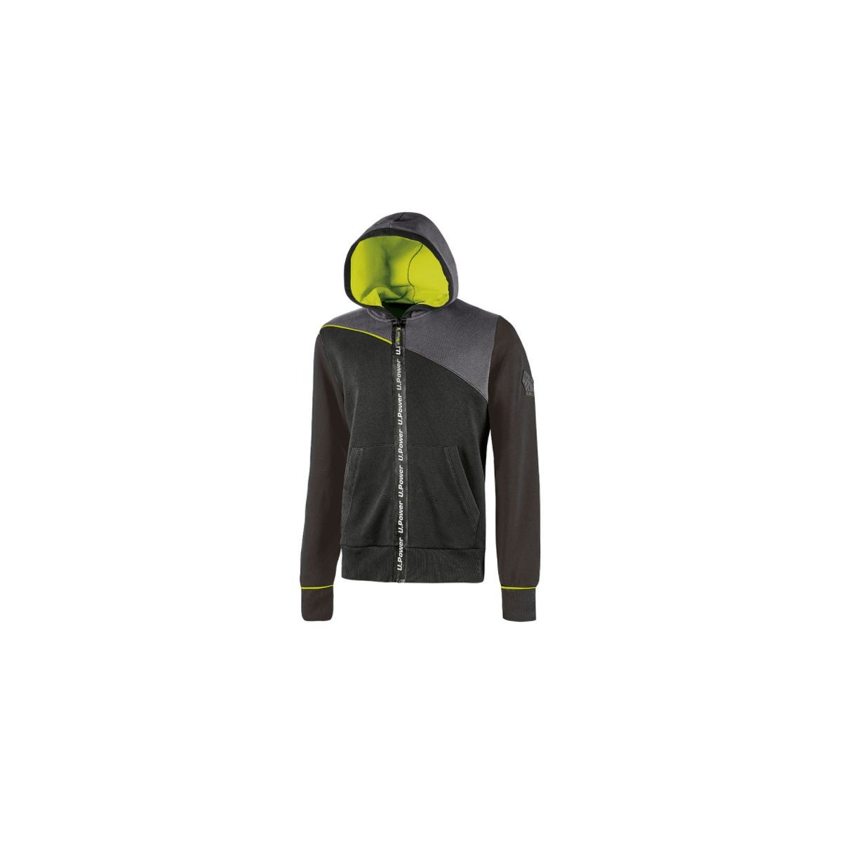 Ce sweat détient une fermeture centrale zippée sur toute la longueur et une capuche réglable. La fermeture imperméable affiche une sérigraphie 'U-Power'. Le sweat est muni de poches plaquées avec ouvertures obliques, de poignets et d'un ourlet inférieur élastiqués et d'inserts en passepoil extensible fluorescent.