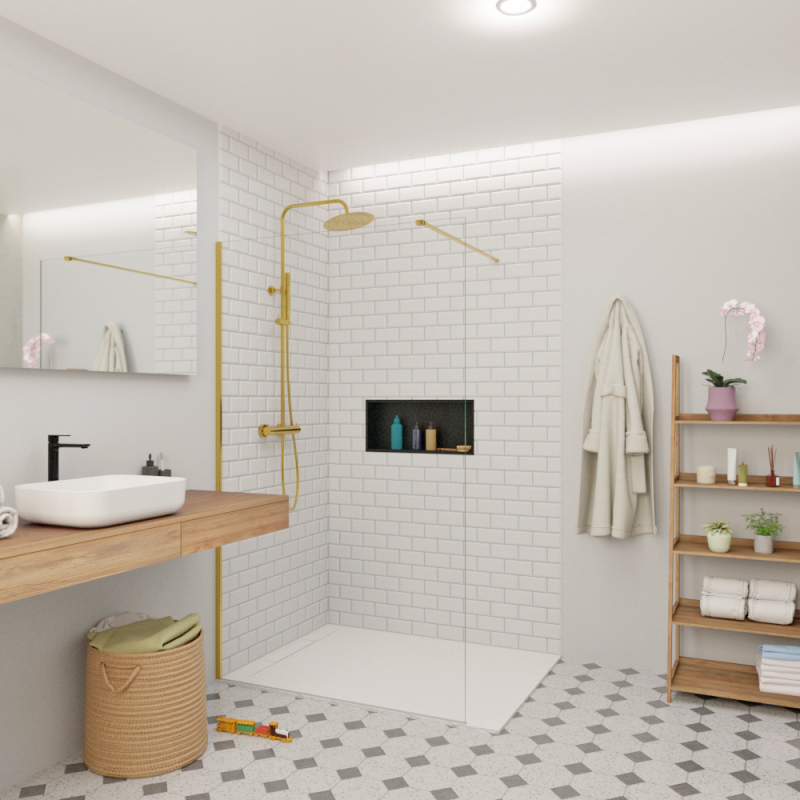 Caractéristiques de la paroi de douche Walk-In anticalcaire avec profilés et bras couleur Or (SATBWI120PRZ) :