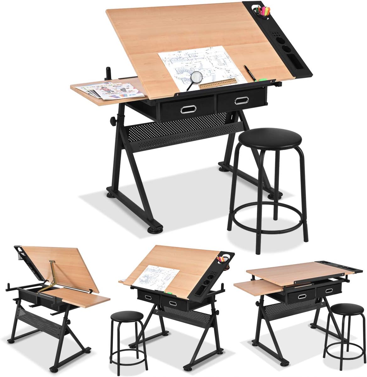 Table a Dessin Inclinable avec Tabouret, Station de Dessin Hauteur Reglable 65-90,5 CM, Plateau Coulissant, 2 Grands Tiroirs et Porte-Stylo
