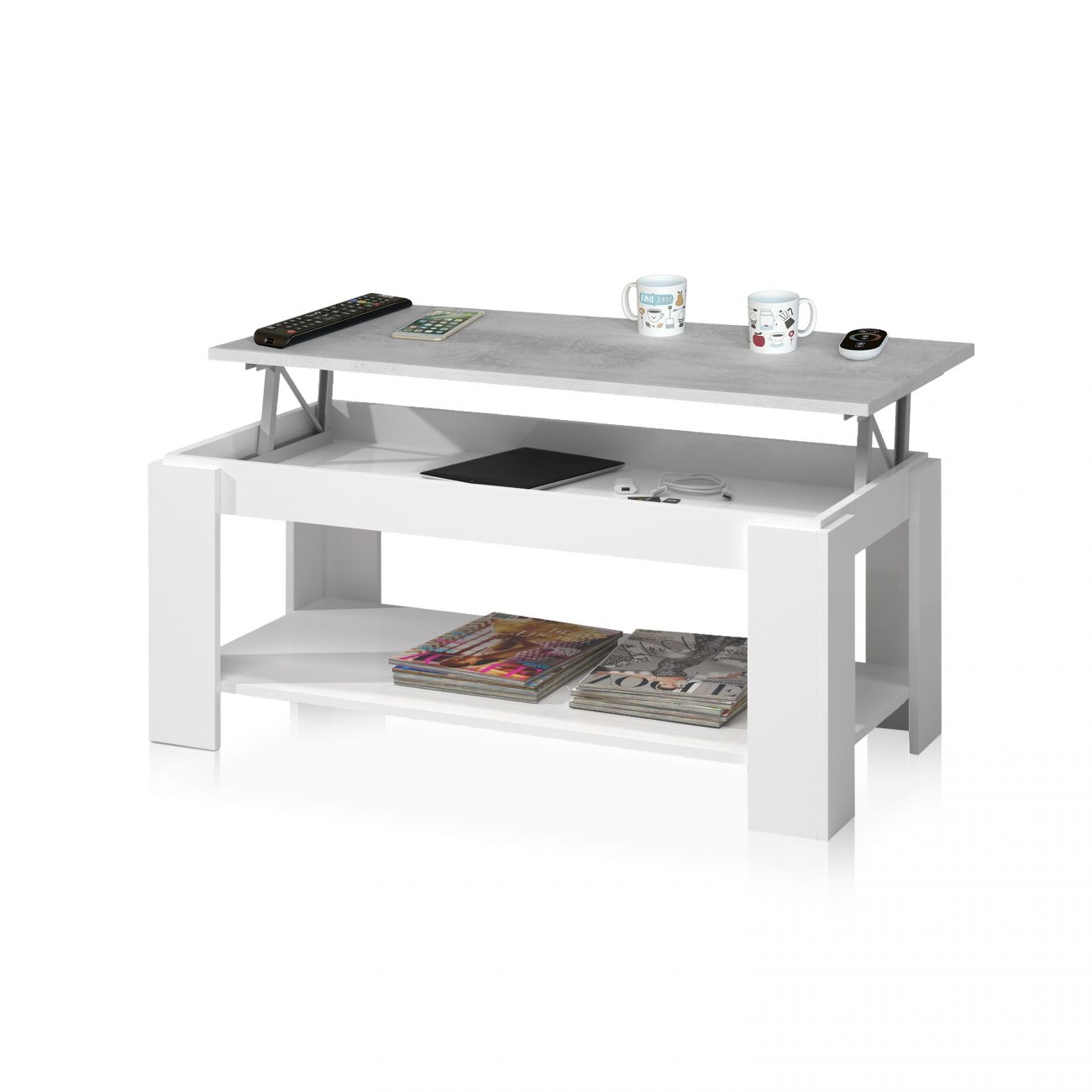 Le mécanisme de levage est très robuste et stable, ce qui évite tout accident. Lorsque le plateau est relevé, la table laisse un espace de rangement vide, idéal pour stocker des magazines, des journaux ou des appareils électroniques tels que des télécommandes, une souris ou un iPad. La table basse relevable Ambit dispose également d'un porte-revues, un second plateau bas à 8 cm du sol, spécialement conçu pour y ranger magazines et journaux.