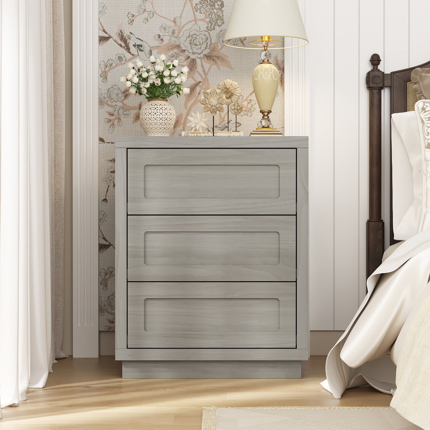 Voir les produits de la même catégorieTable de chevet gris bois,60x75.6x40cm,3 tiroirs spacieux,design pratique,décoratif,chambre moderne,Salon