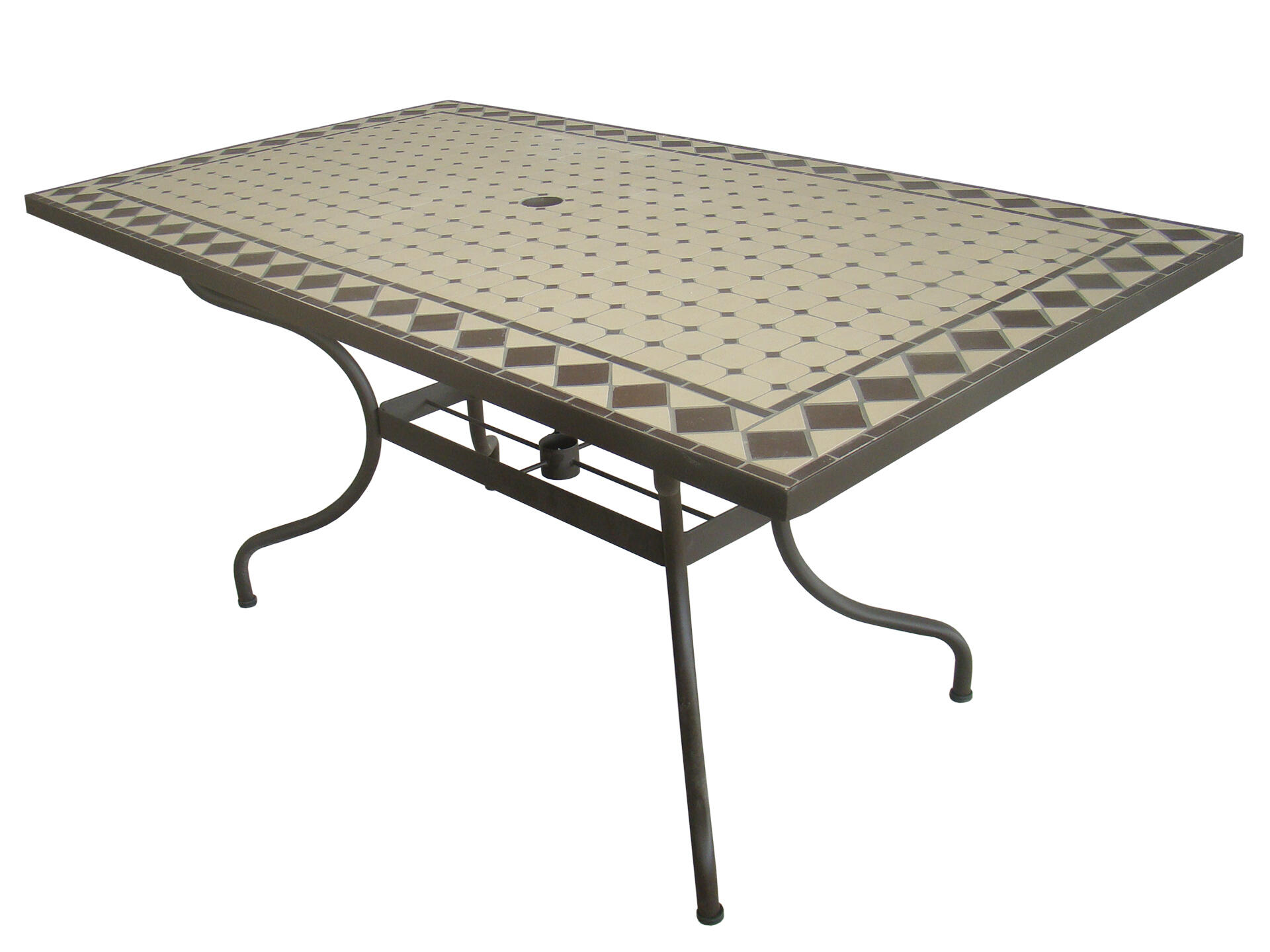 Facile à entretenir et utilisable également en intérieur, cette table de jardin rectangulaire de 160 x 90 cm vous ravira dès sa première utilisation. Le plateau en fibre de béton est recouvert de carreaux en céramique posées à la main. Le piétement est en acier peint de qualité époxy couleur rouille. Afin de protéger votre sol les pieds sont équipés de gros patins en caoutchouc La table rectangulaire MOZAIK possède un trou centrale pour parasol