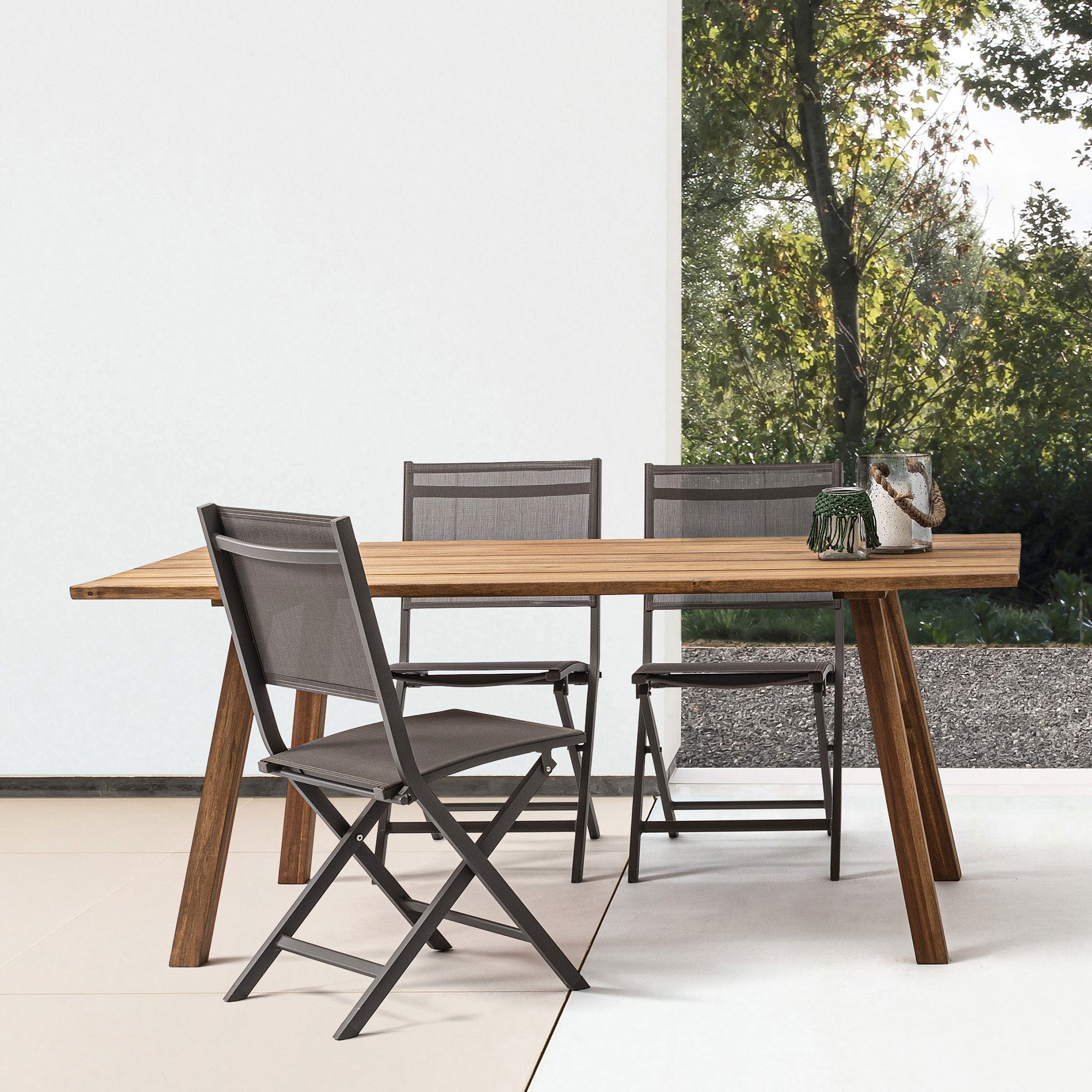 Bénéficiez d'un meuble qui s'intègre parfaitement dans l'environnement naturel de votre extérieur grâce à cette table de jardin en acacia huilé. Elle arbore une forme assez classique, avec un plateau rectangulaire et des pieds légèrement obliques pour souligner le profil de la table. L'ensemble du mobilier est confectionné à partir de bois d'acacia certifié FSC, offrant une grande durabilité et renferme des propriétés naturellement résistantes. De plus, sa finition huilée fait ressortir le veinage si particulier de cette essence. De ce fait, la table conserve sa couleur naturelle marron qui pourra être assortie avec des chaises en bois ou un banc dans votre jardin.